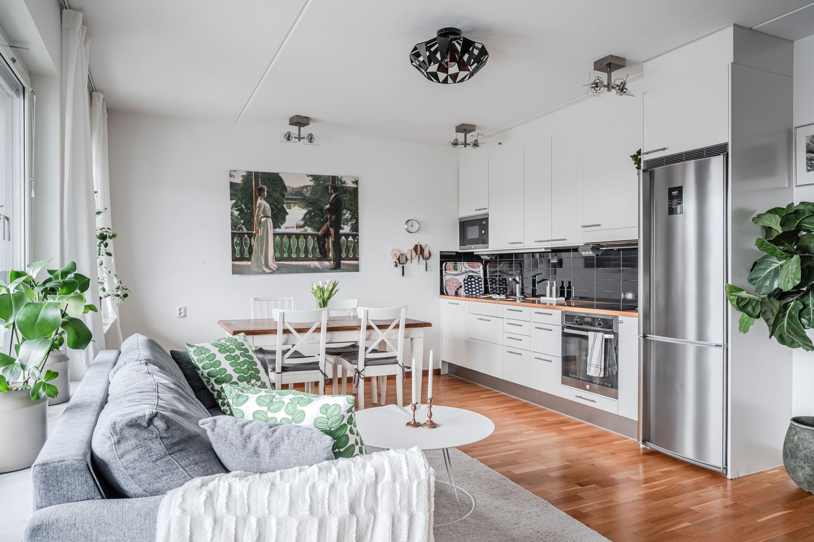 Planlösningen erbjuder hall med ett praktiskt klinkergolv och förvaring i garderober. Bostadens sociala del består av kök och vardagsrum i öppen anslutning till varandra. Köket är stilrent och går i ljusa toner, här finns gott om både arbetsyta och förvaring i lådor och skåp. I köket finns maskinell utrustning i form av inbyggd ugn och micro, kyl och frys, induktionshäll, diskmaskin och köksfläkt. Matplats för 6-8 personer intill fönster. Vardagsrummet är lättmöblerat och rymmer stor soffa, soffbord och har en perfekt tv-vägg. Från den här delen av bostaden når du den stora balkongen som rymmer både loungemöbel och matbord. Söderläget ger ett utmärkt solläge med sol stora delar av dagen. Utöver detta finns ett sovrum/sovdel med plats för förvaring, samt badrum med klinker och kakel, samt tvättmaskin och torktumlare. Dusch, wc och handdukstork finns även det i badrummet.