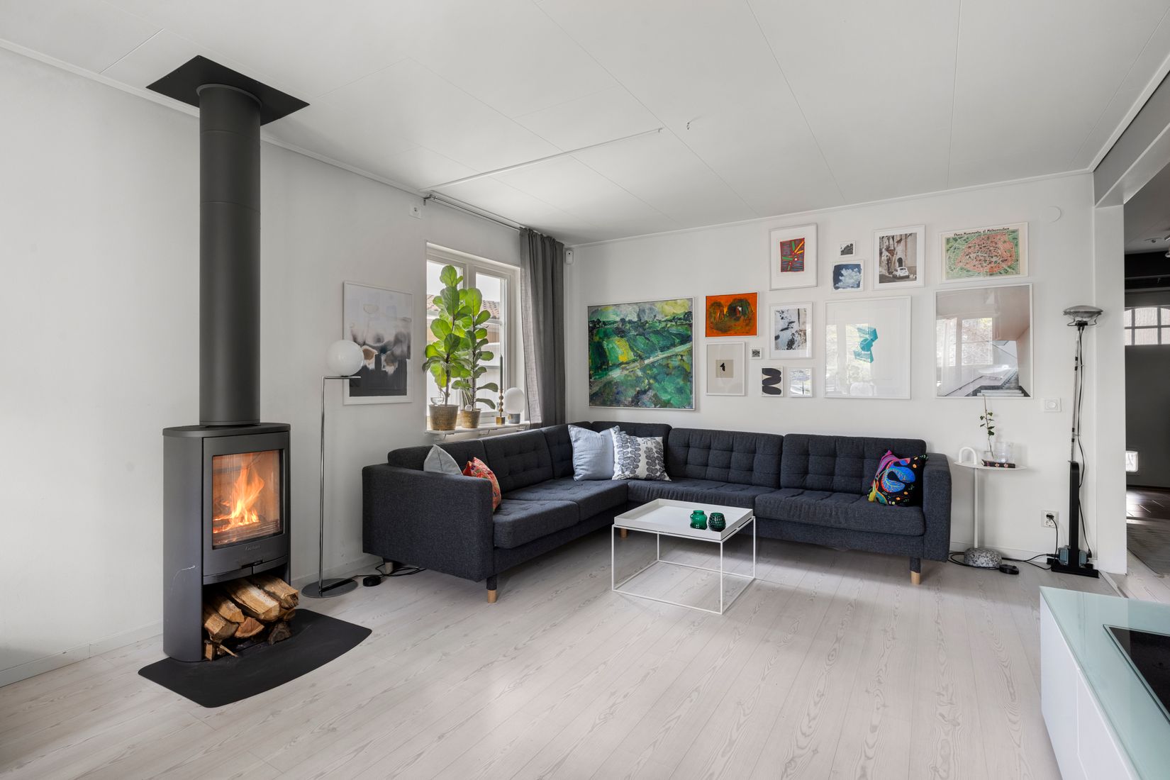 Vidare öppnar sig hemmet i en härlig och halvöppen planlösning mellan vardagsrum och kök. Stora fönsterpartier vetter mot baksidan och släpper in ett härligt ljus, vilket skapar en luftig och inbjudande atmosfär. Här finns gott om utrymme för både vardagsliv och sociala stunder med familj och vänner. Kamin med central plats i rummet sprider både värme och trivsel under årets mörkare årstider.