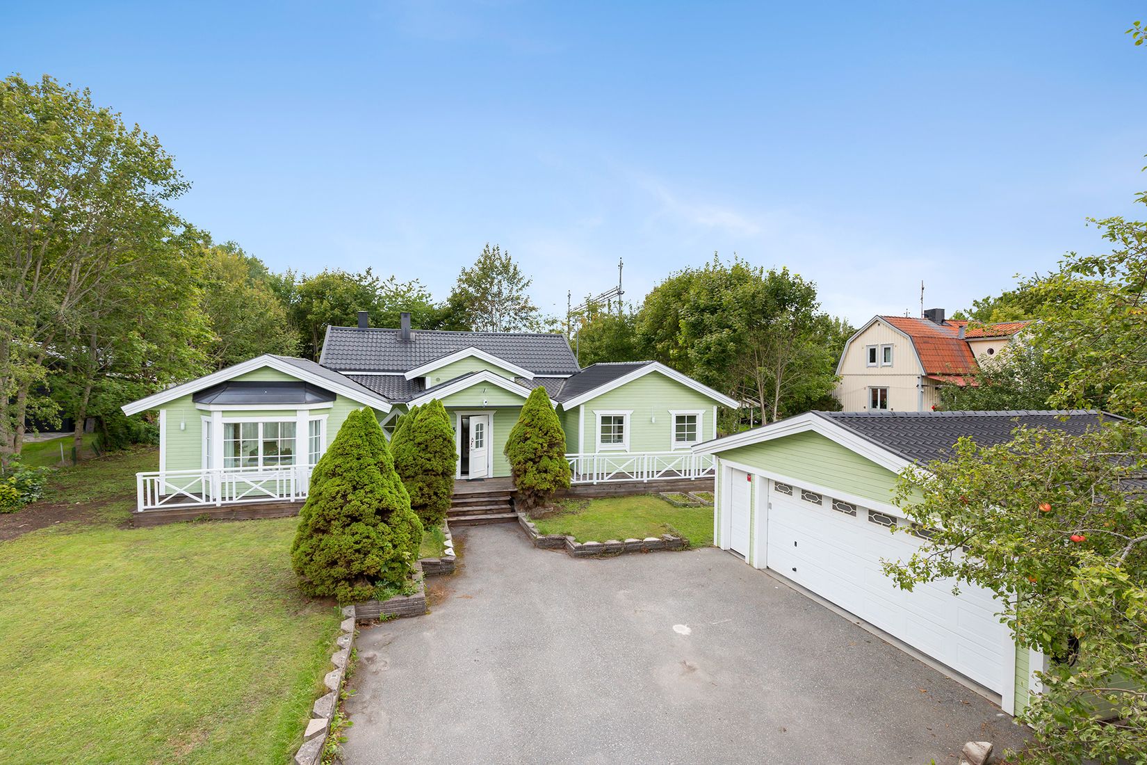 Men låt oss ta det från början. Innanför de vita dubbelgrindarna breder fastigheten ut sig med härliga gräsytor och asfalterade uppfarten med plats för bilar och annat som man vill ställa upp. Dubbelgaraget har inte bara plats för två bilar utan även del som kan nyttjas för hobby och förvaring. Husets entrésida har en spännande arkitektur där huset delas in på ett välkomnande sätt och skapar förväntningar.
