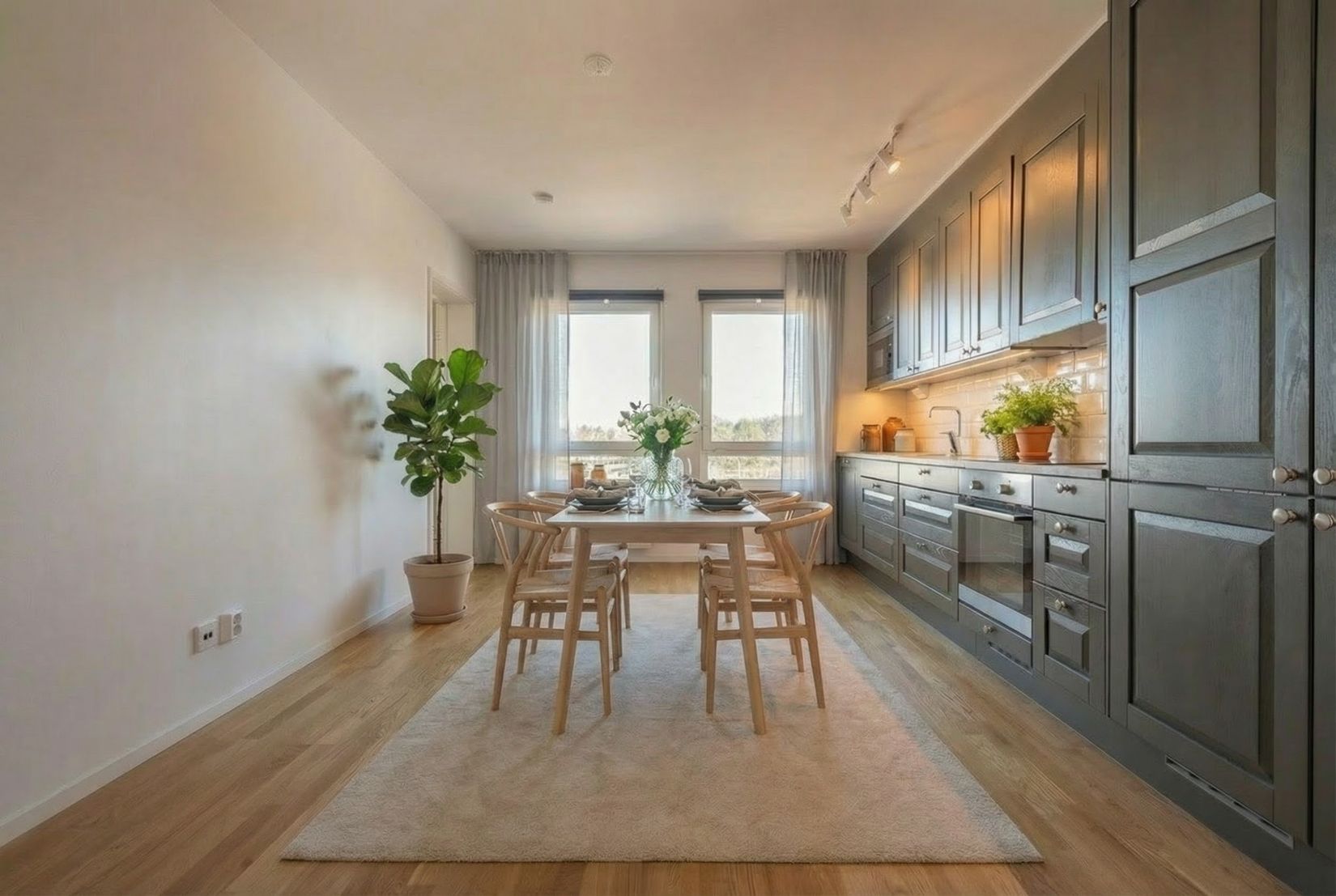 Köket är modernt och stilrent med gråa köksluckor, matchande grå laminatbänkskiva och vitt kakel, vilket ger en tidlös känsla. Köket är fullt utrustat med kyl, frys, diskmaskin, spis, fläkt och ugn. De två fönstren ger ett härligt ljusinsläpp och utsikt över Hägerneholmsskolans fotbollsplan. Här finns även plats för ett matbord för familjemiddagar och umgänge.