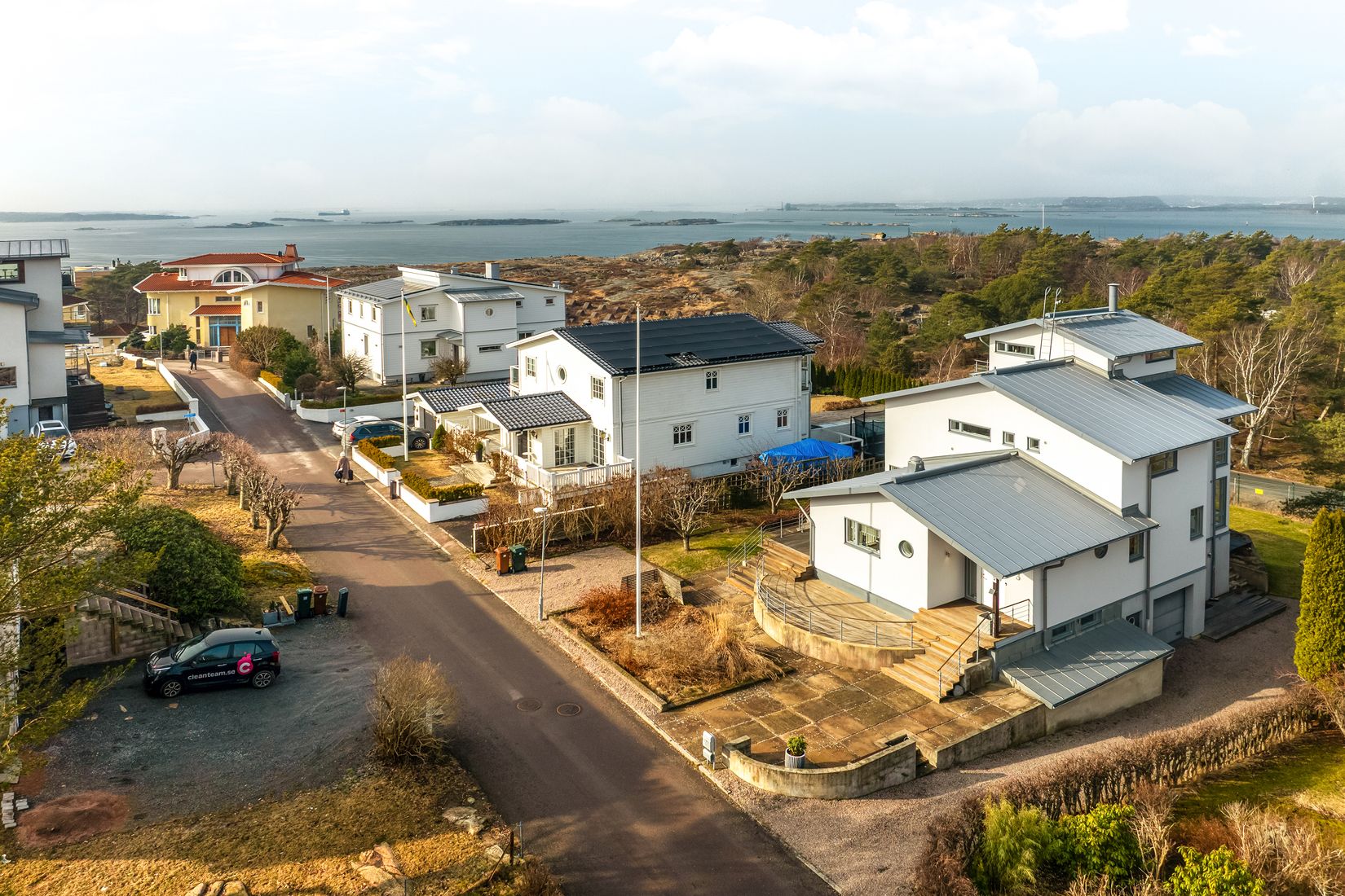 Penthousevåningens spiraltrappa i ek och borstat stål leder ner till mellanplanets stora allrum där glaspartierna vetter i tre olika väderstreck. Havsutsikten kommer igen och utanför finns en lång terrassbalkong. Den blonda ekparketten sträcker ut och förbinder till två sovrum, en walk-in-closet samt ett nyskapat och oerhört sobert badrum. Härifrån leder den raka balktrappan i ek och stål rakt ner till entréplanets mycket stora sällskapsytor. De ligger i öppen planlösning med kök, matsalsdel och vardagsrumsdel. En formren öppen spis är den självklar fokuspunkten. Känslan av stora och ljusa rumsvolymer är påtaglig och ytterst mot havet finns ett glasat uterum. Även på detta plan är havsutsikten fri tack vare det höga läget. Glaspartier i flera väderstreck släpper in kaskader av ljus. Trestavsparketten i ek öppnar ytorna och fortsätter in i det stora köket med central köksö, avskalad design och utgång till terrasser och uteplatser i olika etage. På detta plan finns även sovrum, badrum och tvättstuga. Med egen entré från uppfarten finns en nyskapad gäst- eller uthyrningslägenhet i sluttningsplanet. Den är komplett med badrum, kök, allrum, sovavdelning och walk-in-closet. Den stora villan har även ett stort garage och ansenliga förrådsytor i källarplanet. Närheten till hamn, hav och skärgård är en del av livet i dessa trivsamma kvarter, med båt och vattensport eller kvällspromenader längs kustlinjen. Samtidigt bor du inbäddad av grönska. Det höga och havsnära läget kombinerar känslan av att bo avskilt och exklusivt med all tänkbar service och bra skolor i närområdet. Den stora stadens citykärna känns långt borta men, efter knappa femton minuter i bilen kan du parkera på Avenyn.