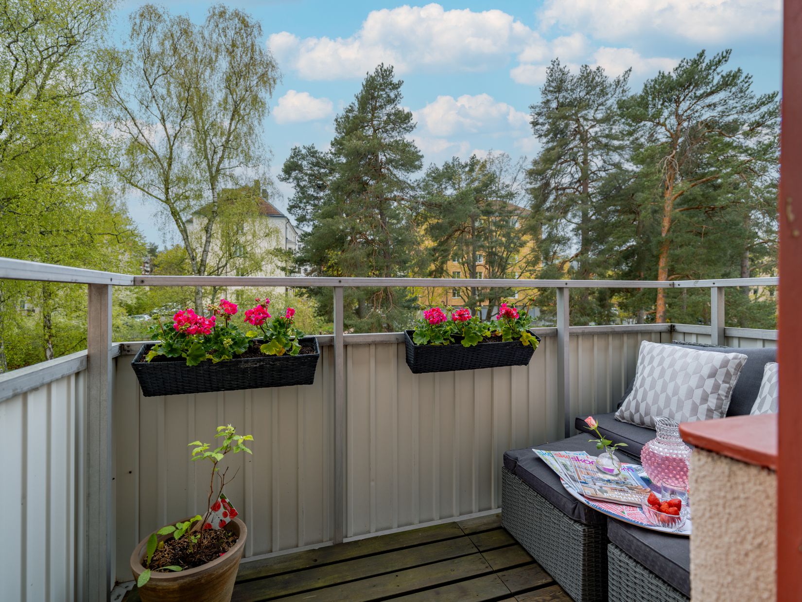 Bostaden disponeras med ett stort vardagsrum med parkettgolv, öppen spis samt fönster i två väderstreck. Härifrån nås balkongen som vetter i söderläge med plats för bord och stolar. Två sovrum, varav det ena har delats med access från varsitt håll och möjliggör tre sovrum för den som önskar. Fräscht kök med matplats och alla bekvämligheter. Hall med gott om förvaring och helklaklat badrum med dusch. Tillhörande rejält vindsförråd som man når med enkel access från lägenheten.