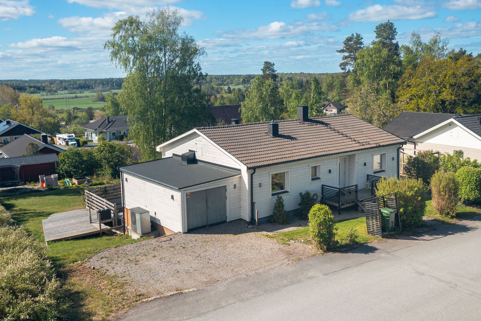 Tomten om 1 283 kvm är en riktig familjedröm – stor, plan gräsmatta på baksidan i soligt sydvästläge, perfekt för lek, avkoppling och uteliv.