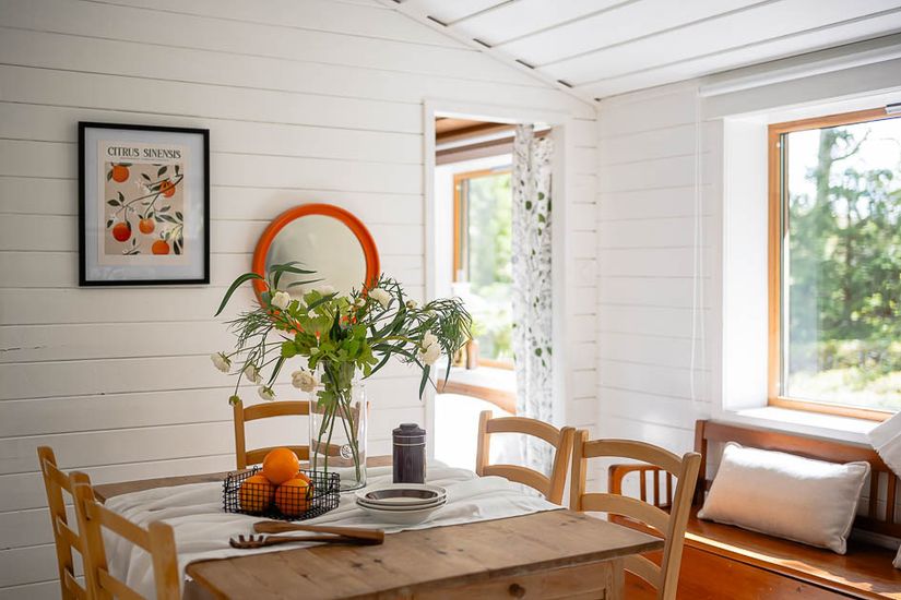 skogspromenader redan före frukost. Stort kök med moderniteterna man kan önska i ett fritidshus. Stämningen är varm och inbjudande, inte konstigt att man aldrig tänkt tanken att äta frukost någon annanstans. Om det inte är sommar förstås, för då njuter man av morgonkaffet ute på balkongen såklart. I rummet jämte köket möter man det lugn man behöver för att läsa en bok när det regnar, familjen har använt rummet som sovrum med plats för både kläder och drömmar. Sällskapsrummet är av modell större. Här inne är det inga som helst problem att få plats med en rejäl soffgrupp utan att det känns trångt. Tack vare att rummet sträcker sig över husets fulla bredd har man fönster åt tre håll, vilket gör att det alltid kommer in ljus i rummet Här kan man lägga övernattande gäster.