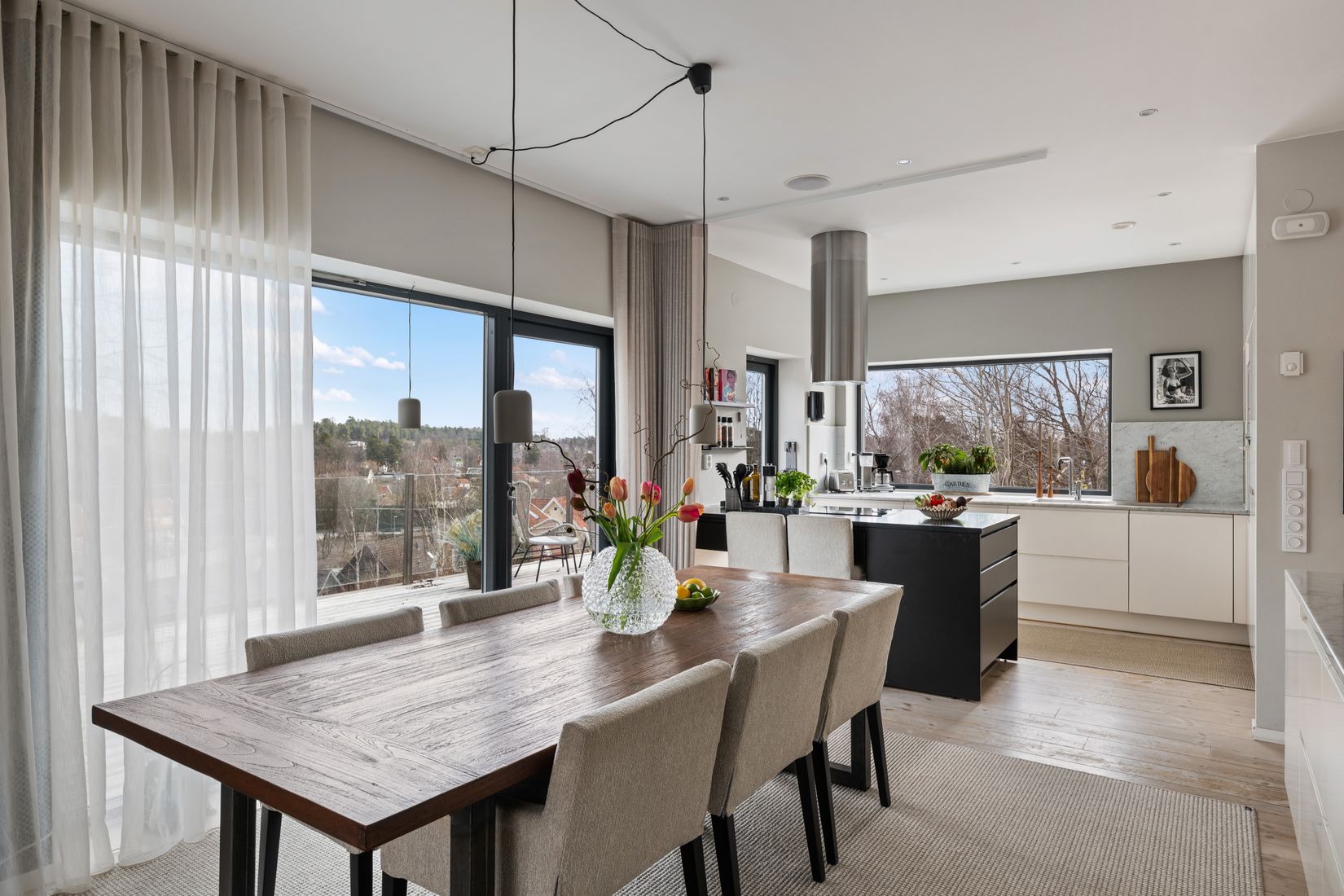 Interiört präglas planlösningen av öppna och ljusa ytor. Entréplanet har en välkomnande hall med dubbla garderober, ett stilrent badrum och en praktisk tvättstuga. Köket är modernt i vitt och svart med bänkskivor i marmor, och har alla moderna bekvämligheter och funktioner. Furugolvet ger en varm känsla, medan allrummet och TV-rummet, separerade med skjutdörrar, erbjuder utrymme för både avkoppling och sociala aktiviteter. Vattenburen golvvärme på båda planen gör hemmet bekvämt året runt.