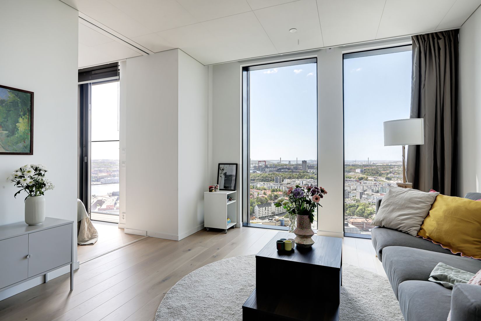 Den öppna planlösningen mellan kök och vardagsrum, på cirka 22 kvm, skapar en ljus och luftig atmosfär. De stora fönstren från golv till tak släpper in eftermiddags- och kvällsljuset och ramar in en vy som sträcker sig över Göteborgs takåsar och vidare mot horisonten. Här får du njuta av gyllene solstrålar och spektakulära solnedgångar – varje kväll blir en upplevelse.