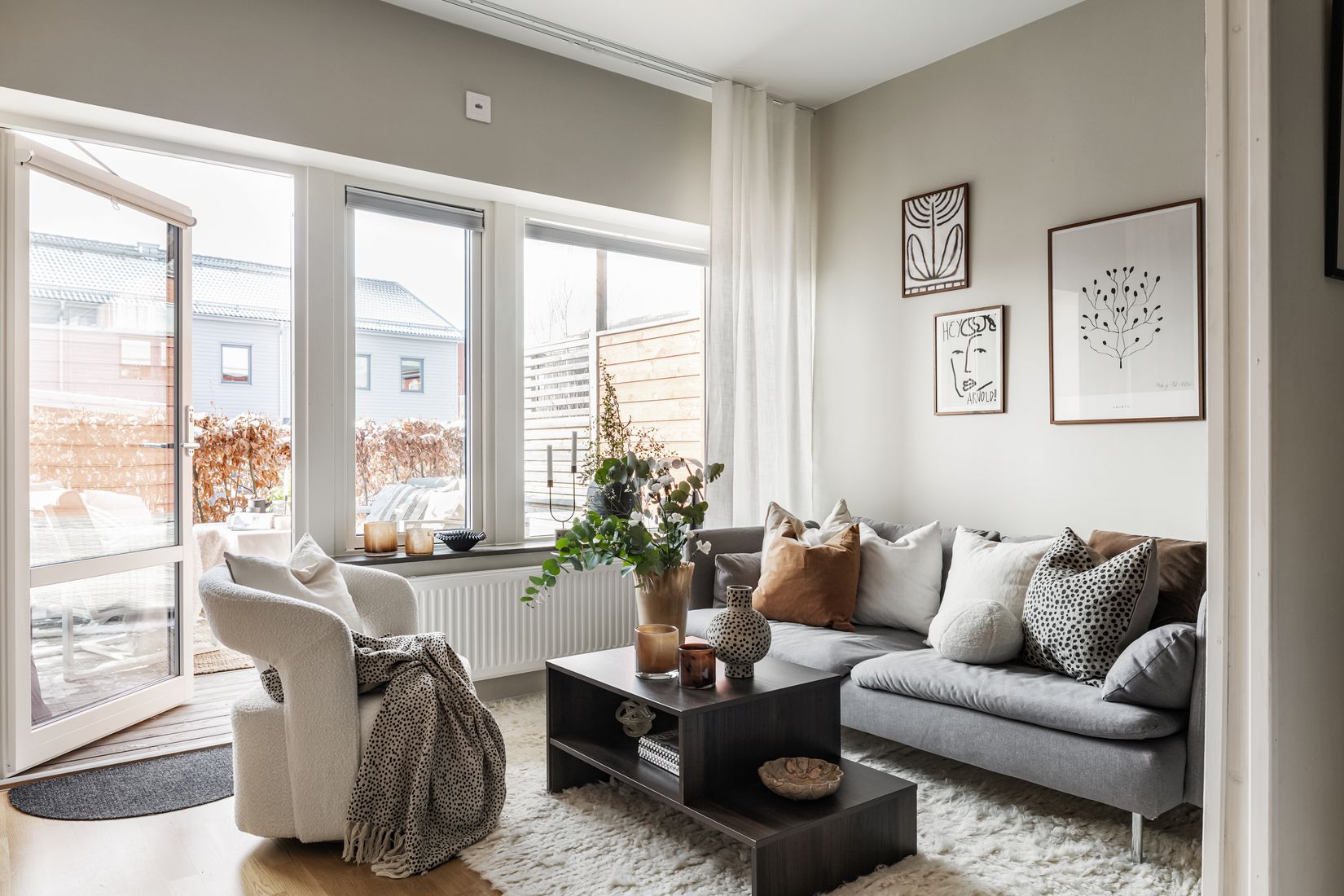 Från bostadens sociala ytor öppnar en altandörr ut till din egna uteplats som inhägnas av vacker avenboks häck. Gott om plats för sittgruppp och grillen. Här finns ett praktiskt förråd i anslutning.
