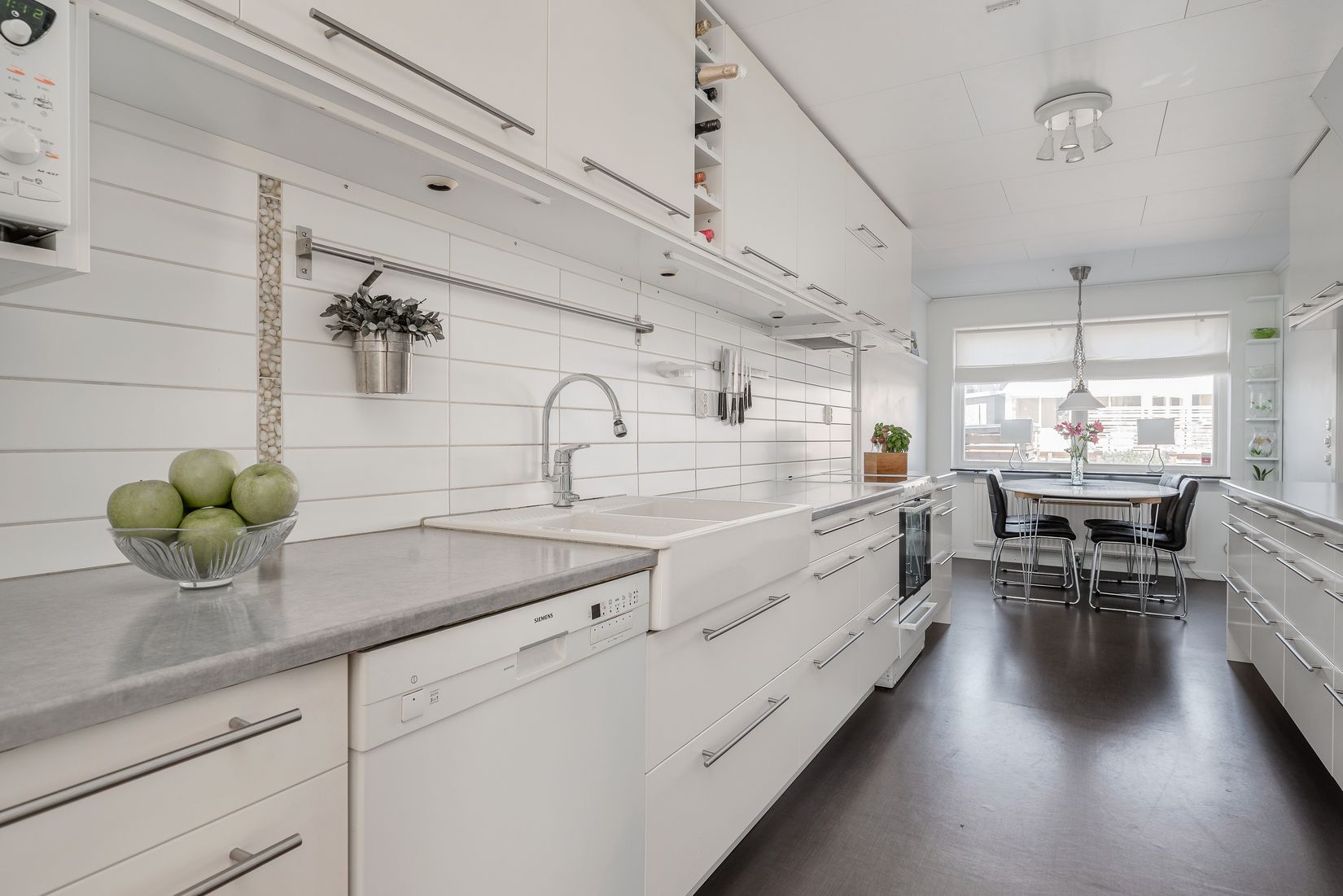 Baksidan som ligger med härligt söderläge är belägen mot ett grönområde vilket ger lite extra frihetskänsla och här njuter man gärna av solen på någon av de båda altanerna. Det finns även en större altan på framsidan.