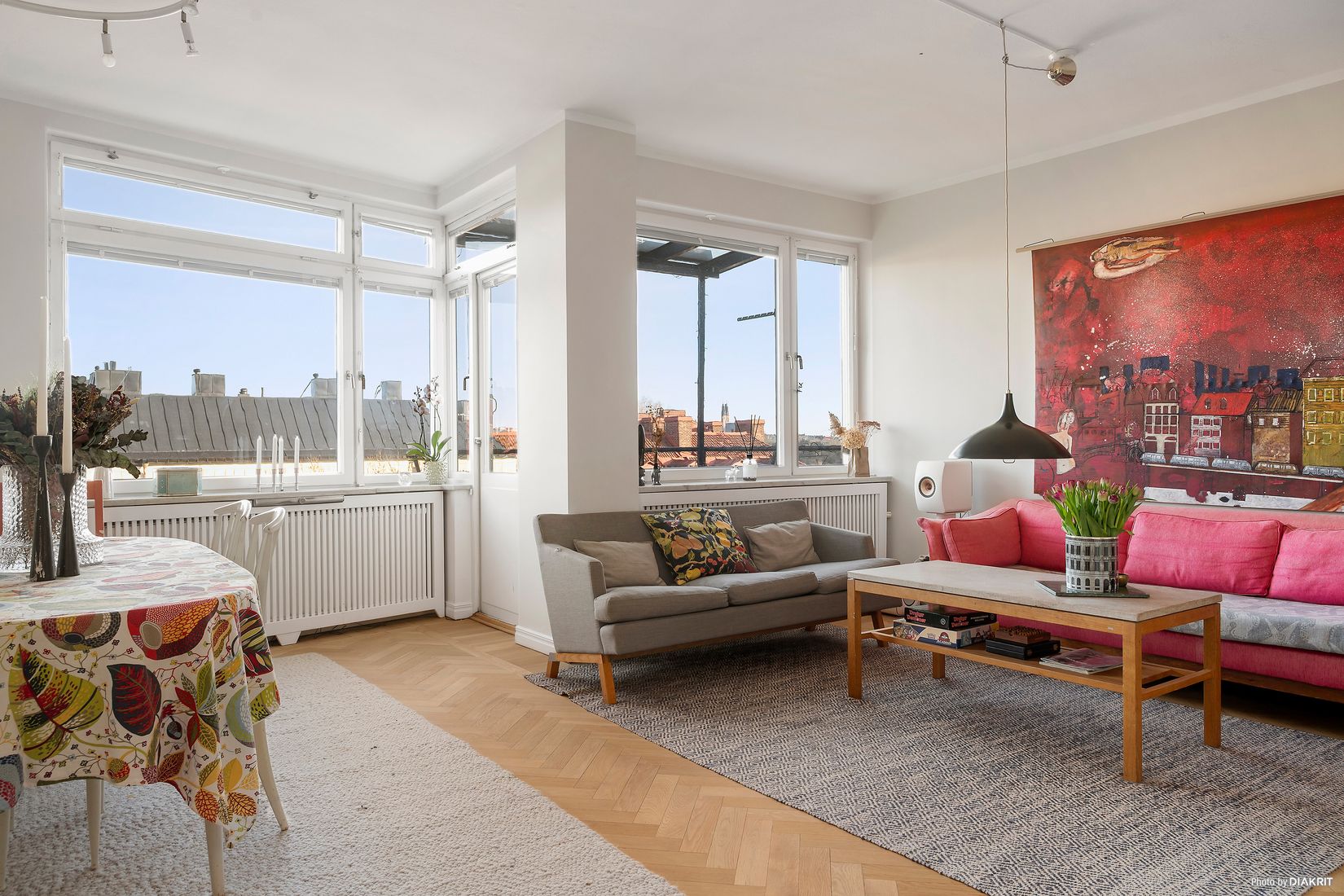 Bostaden rymmer två rymliga sovrum, båda med stora fönster och en vacker vy över stadens takåsar. Lägenheten erbjuder dessutom både badrum och gäst-wc vilket bidrar till en bekväm och funktionell vardag.