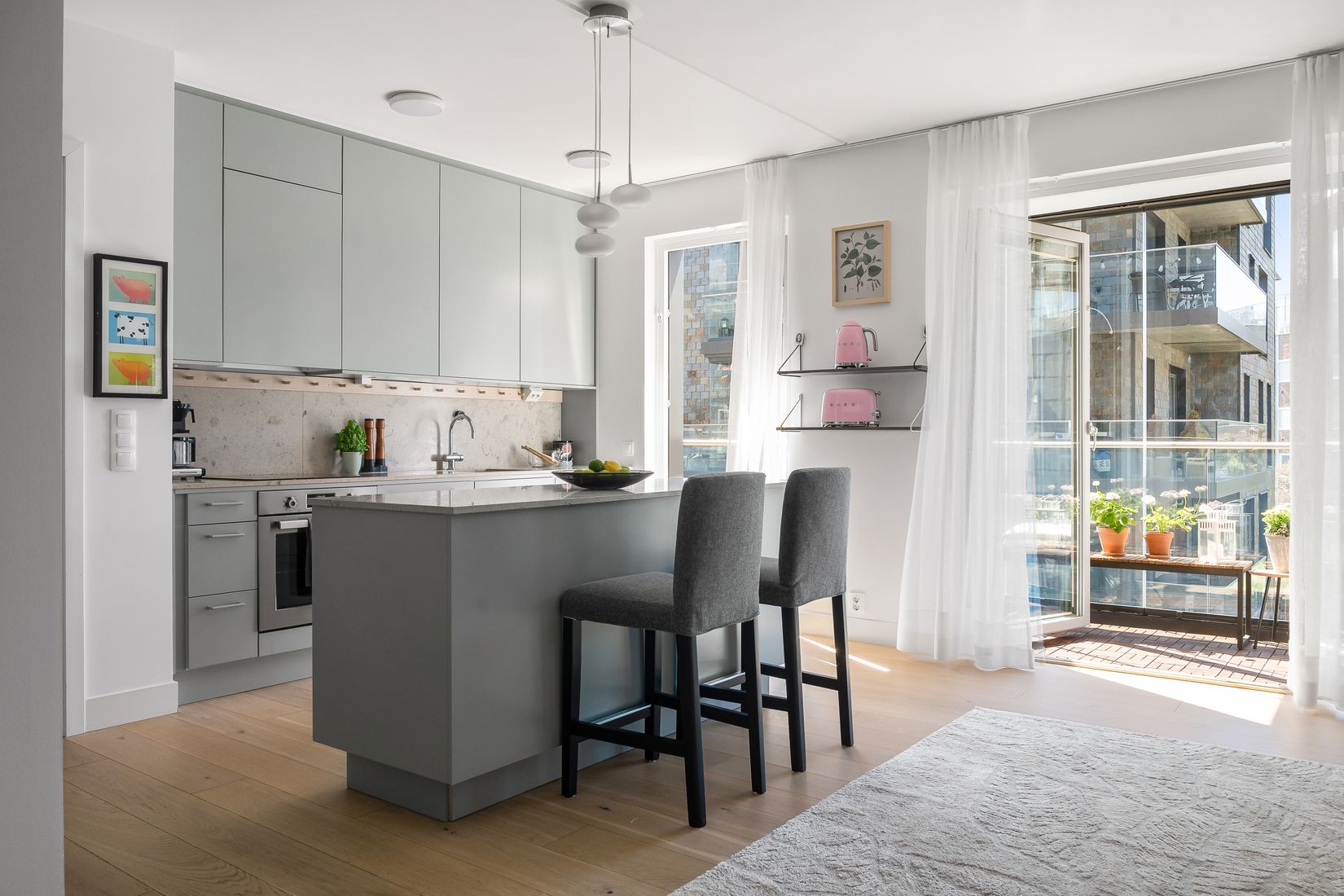 Det smakfulla köket bjuder på moderna lösningar, generösa arbetsytor och plats för 8 personer kring matbordet. Vardagsrummet, som ligger i öppen planlösning mot köket, blir en naturlig samlingspunkt med tre olika utgångar till den stora balkongen och vinterträdgården - perfekt för både lugna morgnar och sociala kvällar.