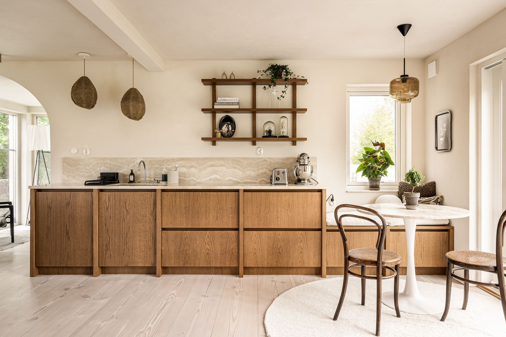 "Visionen har från start varit att få in behagliga proportioner där vi har hämtat inspiration från naturens egen design, bland annat genom att använda oss av olika geometriska former som tillsammans bildar en harmonisk melodi. Utvalda hörn har blivit avrundade, en dagöppning har fått ett smalt högt valv medan en avskiljande vägg fått en bredare välvd form. Några rektangulära fönsterpartier har utarbetats efter det gyllene snittet i dess fönsterspröjssättning, varav någon är i ek och en annan i metall. Basen i interiören är ljus och levande där olika nyanser av kalkpigment från Island fått pryda väggar och tak, vilket ger en luftig karaktär till huset. Långa, breda golvtiljor och trappor i vitlaserad douglasgran möts upp med bronsfärgade glaspartier och där travertinsten möter brunbetsad ek i både köks- och garderobsfronter, allt för att få mjuka övergångar som tilltalar sinnet både visuellt och texturalt. Unika lösningar där formgivning och hantverket fått stå i centrum.”
