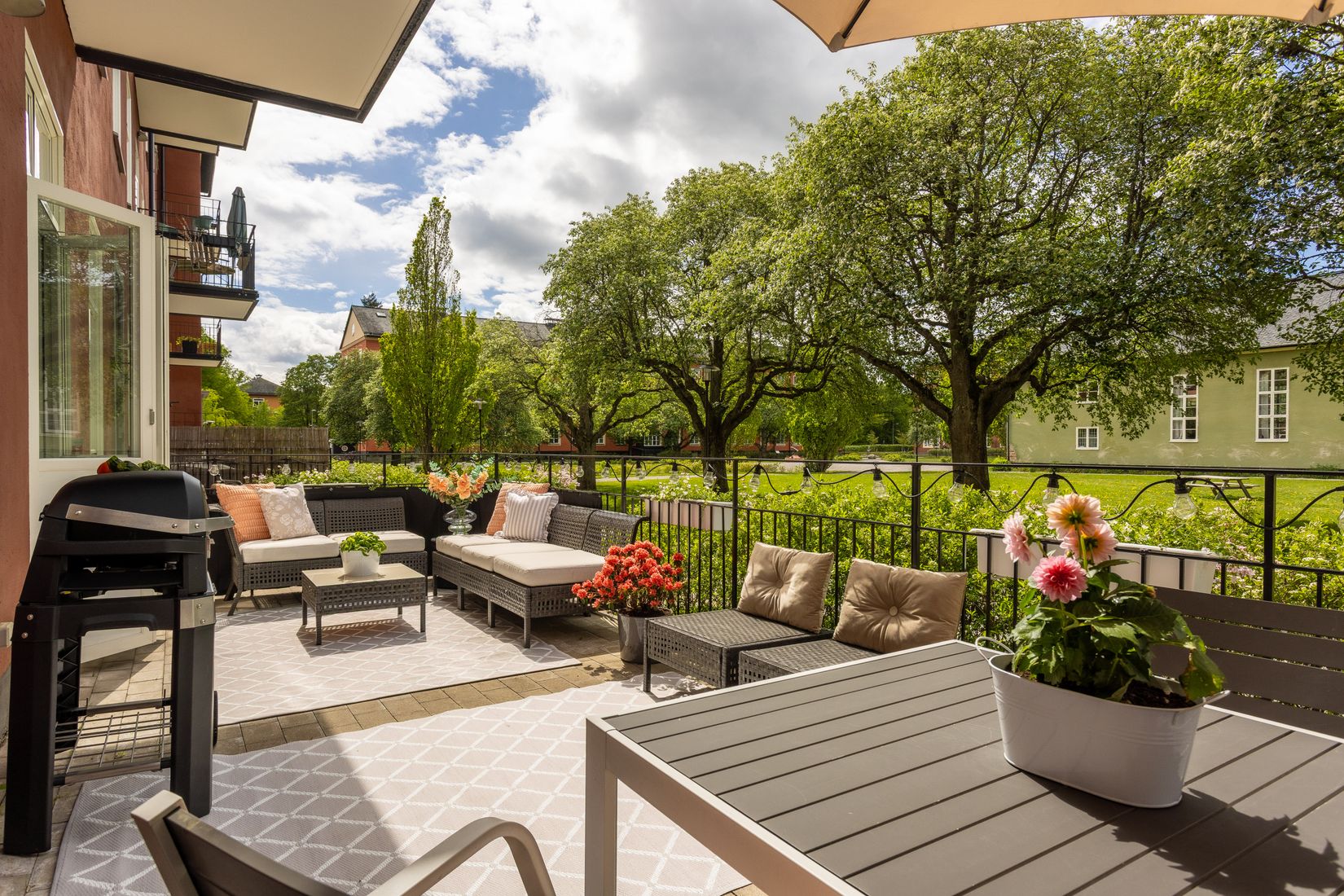 Från vardagsrummet når du bostadens stora uteplats i soligt västerläge, en egen oas där du kan njuta av eftermiddags- och kvällssolen.