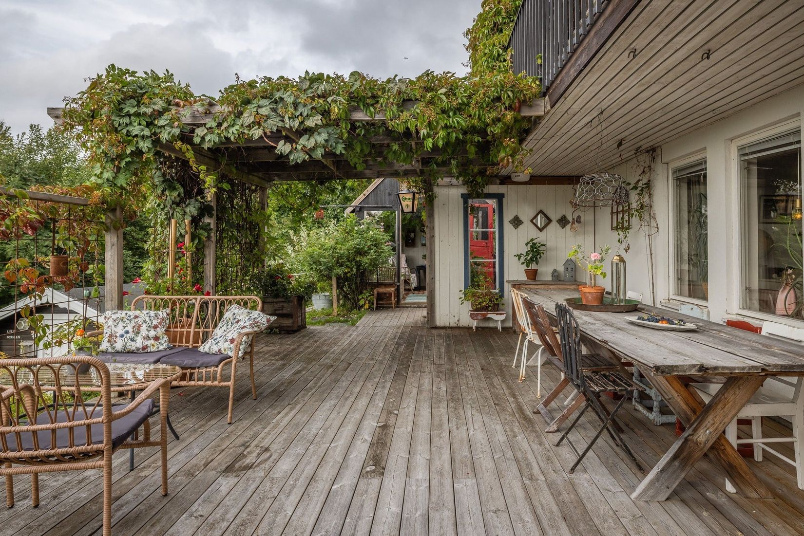 En trappa ner möter ni ett stort vardagsrum med eldstad som enkelt går att dela av och skapa ytterligare sovrum. Utgång till en härlig oas av uterum, vedeldad badtunna och soldäck med pergola som leder er vidare ner i trädgårdens olika etager samt växthus och gäststuga. En plats att njuta på under sommarhalvåret. Vidare in i bostadens källarvåning finns förråd, toalett, dusch med bastu samt pannrum.