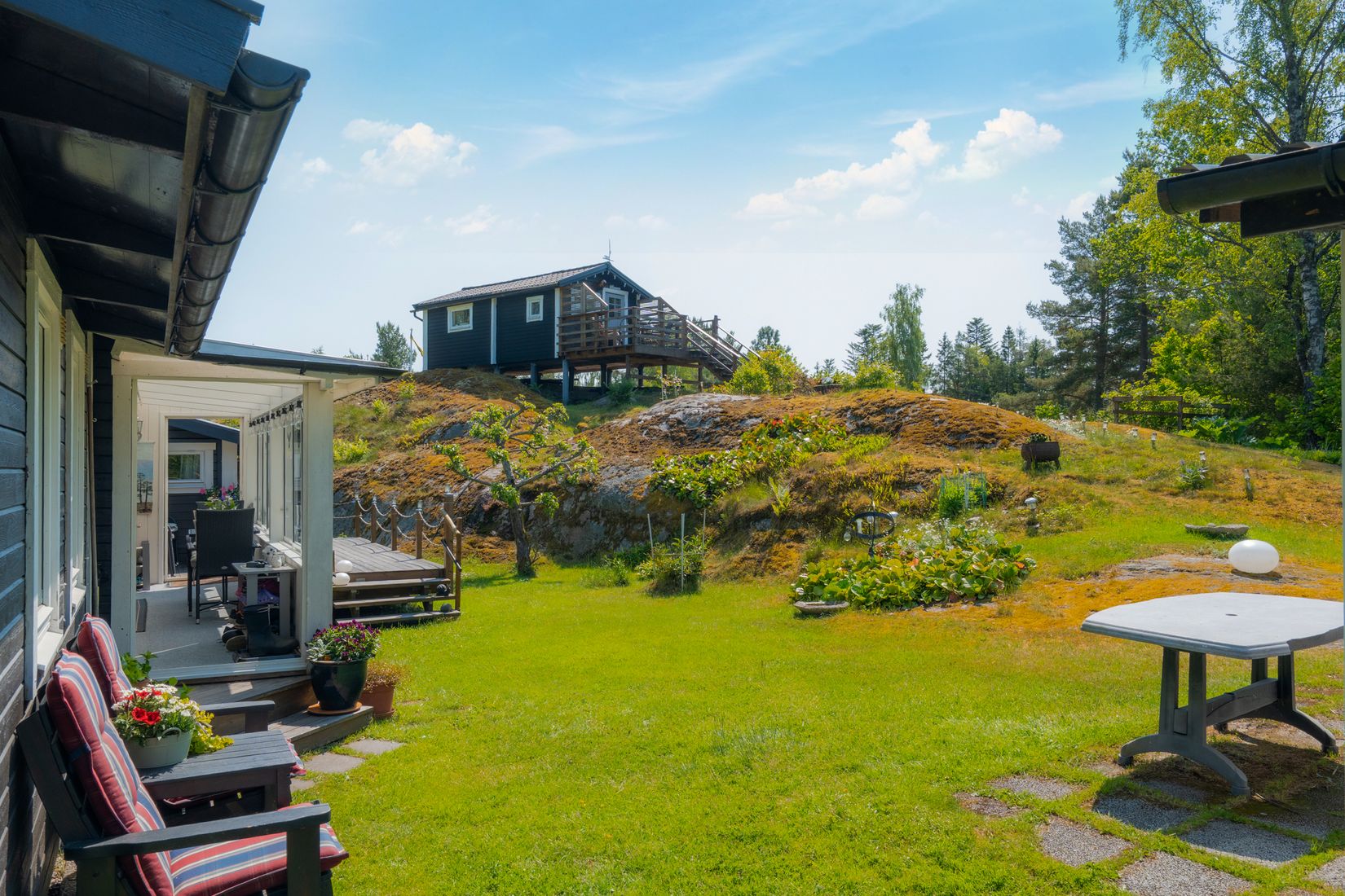 På den övre delen av tomten ligger ett separat gästhus, perfekt för övernattande gäster eller tonåringar som vill ha eget utrymme. Gästhuset erbjuder ytterligare sovplatser och har egen uteplats med utsikt över omgivningarna.