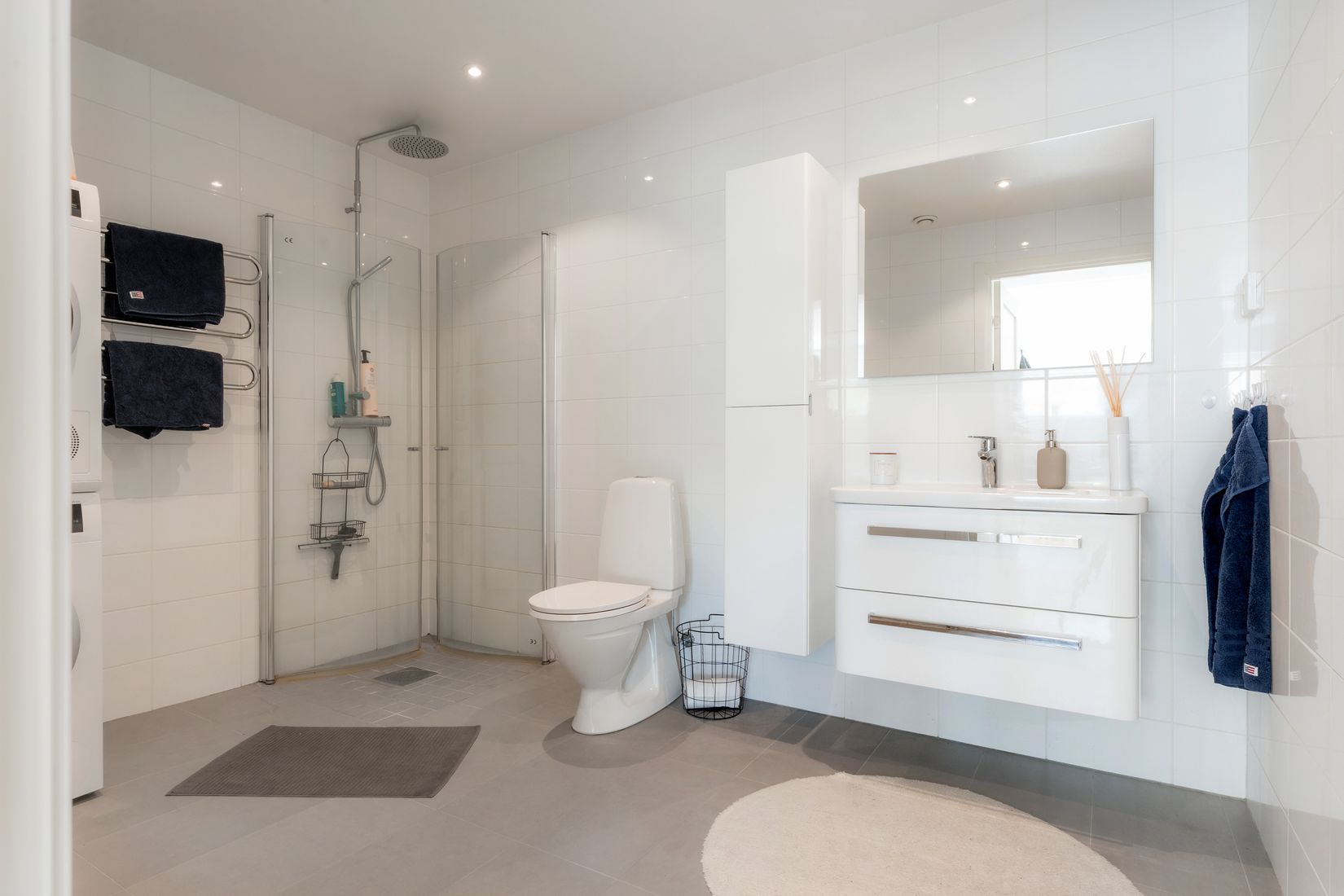 Lägenheten har ett stort modernt badrum, med dusch, WC, kommod och extra skåp för handdukar.