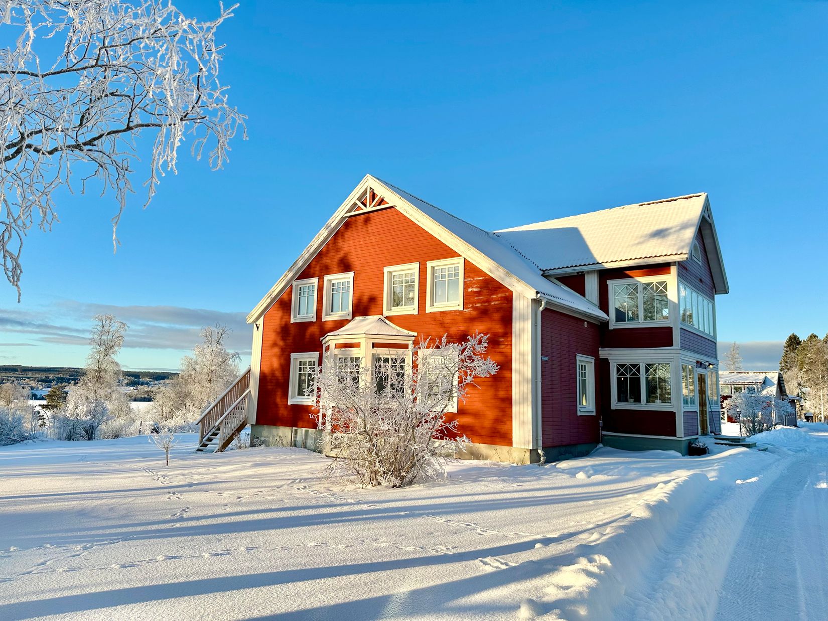 Den vackra huvudbyggnaden från 1920-talet, varsamt renoverad, med välkomnande tambur och glasveranda, bjuder på ljusa sällskapsytor, öppen spis, rogivande sovrum och utsikt över vattnet och/eller Storsjöbygden. På entreplan finns 3-4 sovrum, salong/vardagsrum med burspråk och ett stort praktiskt kök med bra bänkytor för matlagning och öppen planlösning mot generös matplats. Därifrån finns utgång till en stor altan under tak i sydväst. Övervåningen består idag av ett stort allrum och sju sovrum, badrum, wc och duschrum. På källarplanet finns även en bastu, med plats för många, och ett ljust och rymligt allrum som kan nyttjas på många olika sätt. Byggnaden har bland annat nya fönster med tidsenliga spröjs och tilluftsventiler, nyrenoverade badrum och nyinstallerad värmepump.