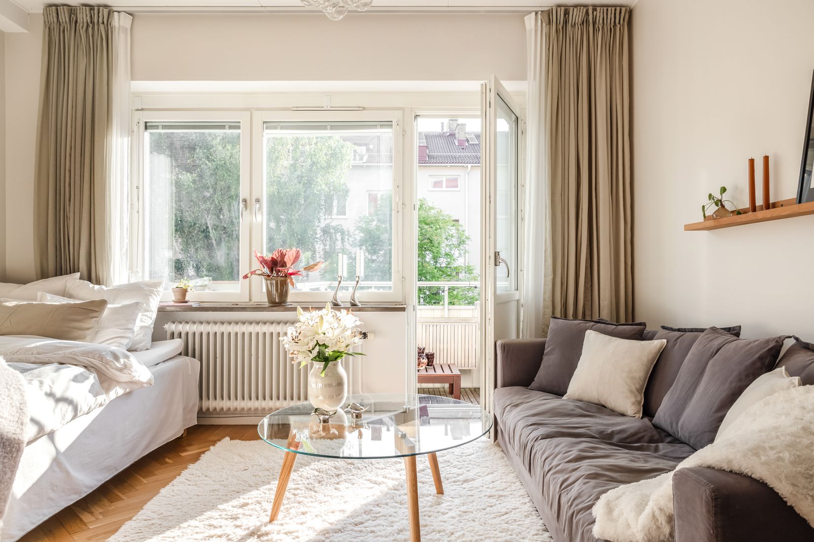 40-tals attributet med väl tilltagen takhöjd gör sig här påmind och ger bostaden en luftighet som är behaglig. I hela bostaden ligger genomgående fiskbensparkett som möter släta ljusa väggar. Ljusinsläppet från väster ger bostaden ett härligt naturligt ljus. Då lägenheten även har balkong i västerläge, vilket många lägenheter i denna storlek saknar, blir det absolut en tillgång utöver det vanliga jämfört med liknande lägenheter i området.