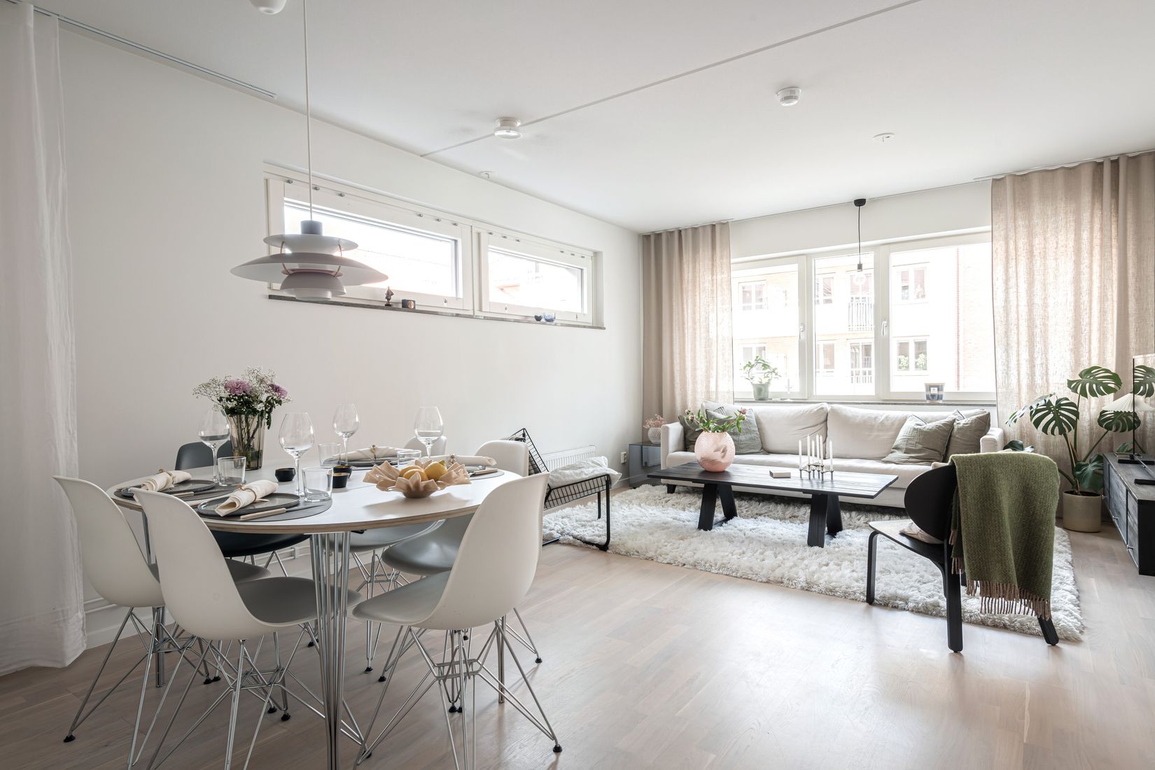 Bostaden är genomgående ljus med stora fönsterpartier i vardagsrum och sovrum. Här samsas välplanerade ytor med funktionella materialval och en planlösning som ger en naturlig uppdelning mellan sällskapsdel och privatrum. Det stilrena köket från Vedum har rostfria vitvaror och parallell arbetsyta som passar både vardagskocken och gästerna på spontanbesök. Vardagsrummet har plats för både matgrupp och soffa och får in ljus från två väderstreck. Sovrummet är rymligt med plats för dubbelsäng och utgång till bostadens balkong, som vetter mot den lugna innergården – perfekt för eftermiddagssolen. Intill ligger ett badrum med vitt kakel, grå klinker, glasdörrar till duschplats och full tvättutrustning.