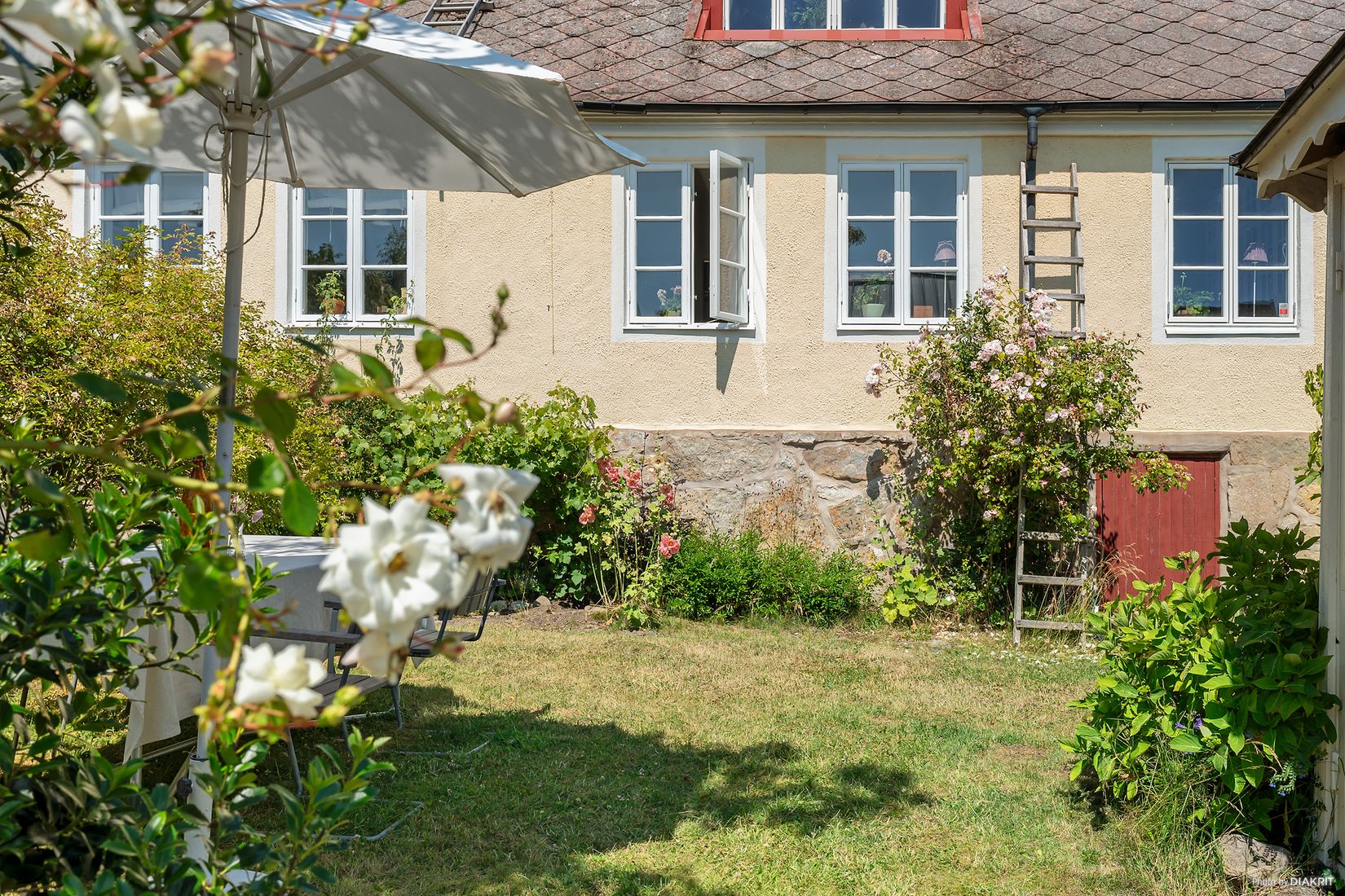 I den djupt grönskande trädgården varvas rosor med bl.a buxbom, syren, fruktträd och odlingslådor. Allt omgärdas av grön växtlighet, murar och staket som skapar avskildhet. Här är flera uteplatser och även ett lusthus samt ett nyuppfört gästhus med allrum, badrum, pentry samt sovloft. Alldeles nära finns hamn, hav och fiskelägets puls med bl.a krogar, restauranger, café, fiskaffär och plats för boulespel. Vidare har man natursköna, milslånga promenad- och cykelstråk utmed havet både norr- och söderut.