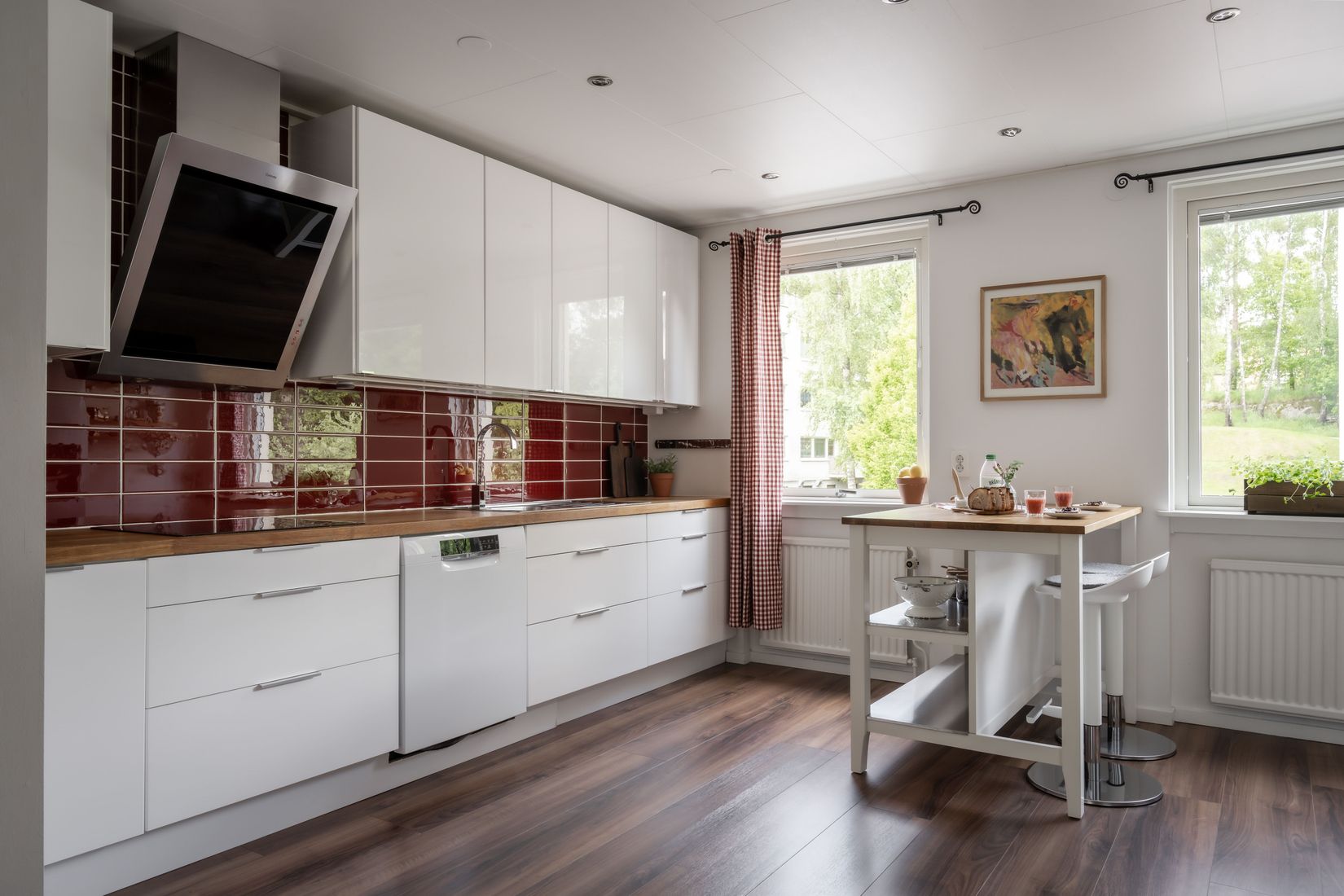 Från vardagsrummet når du den härliga balkongen med naturskön utsikt över den lummiga innergården. Här erbjuds både grillmöjligheter och lekplats för boende i föreningen. Utan något hus mittemot blir detta en skön och privat plats att trivas på med sällskap av solen från tidig eftermiddag till kväll.