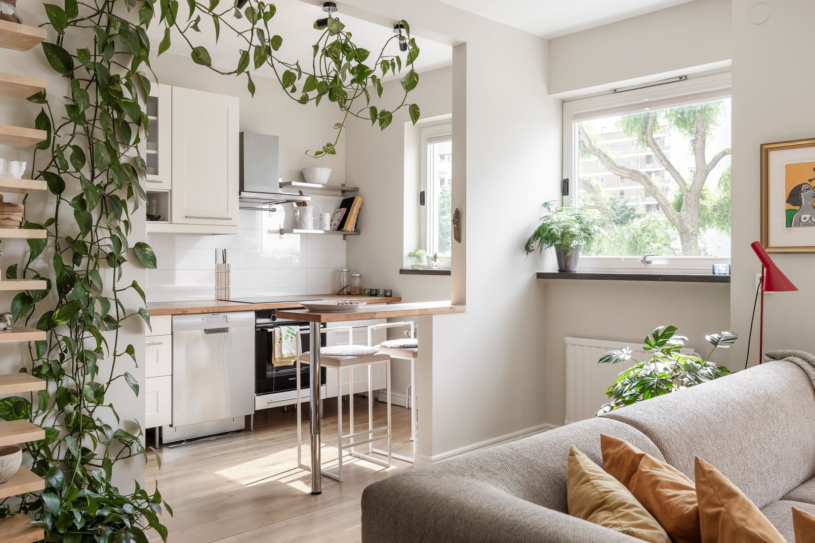 Bostaden 74 välplanerade kvadratmeter fördelar en hall med gäst-wc, ett sovrum med anslutande badrum och walk in closet samt ett kök som är öppet mot den luftiga sällskapsavdelningen. Via detta sociala rum nås den härliga balkongen som vetter mot havet i väster och är berikad med eftermiddagssol. Just ljuset spelar en stor roll i bostaden. I synnerhet i sällskapsavdelningen och köket där ljuset får fritt flöde från burspråk, balkong och fönster. Det som får denna lägenhet att sticka ut lite extra är de generösa sociala ytorna. Den del som är matplats idag har ursprungligen varit ett separat rum och går att återskapa om man vill och göra det till en trerummare igen.