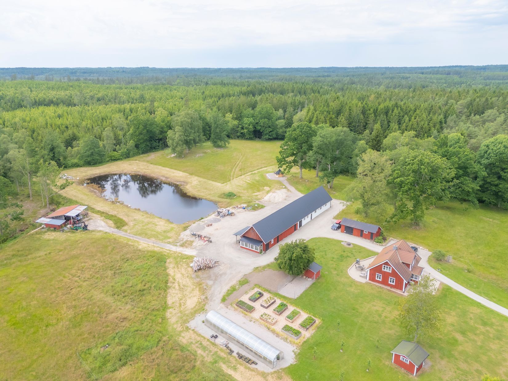 Utöver boningshuset erbjuder inägorna vedbod med förråd, gäststuga med el och värme, välskött och tillbyggd lada med gjutet golv, tre boxar, nytt tak och verkstadsdel. Här finns även växthus, damm med grillkåta och en paddock som idag används som parkering för verksamheten (verksamheten ingår ej i köpet).