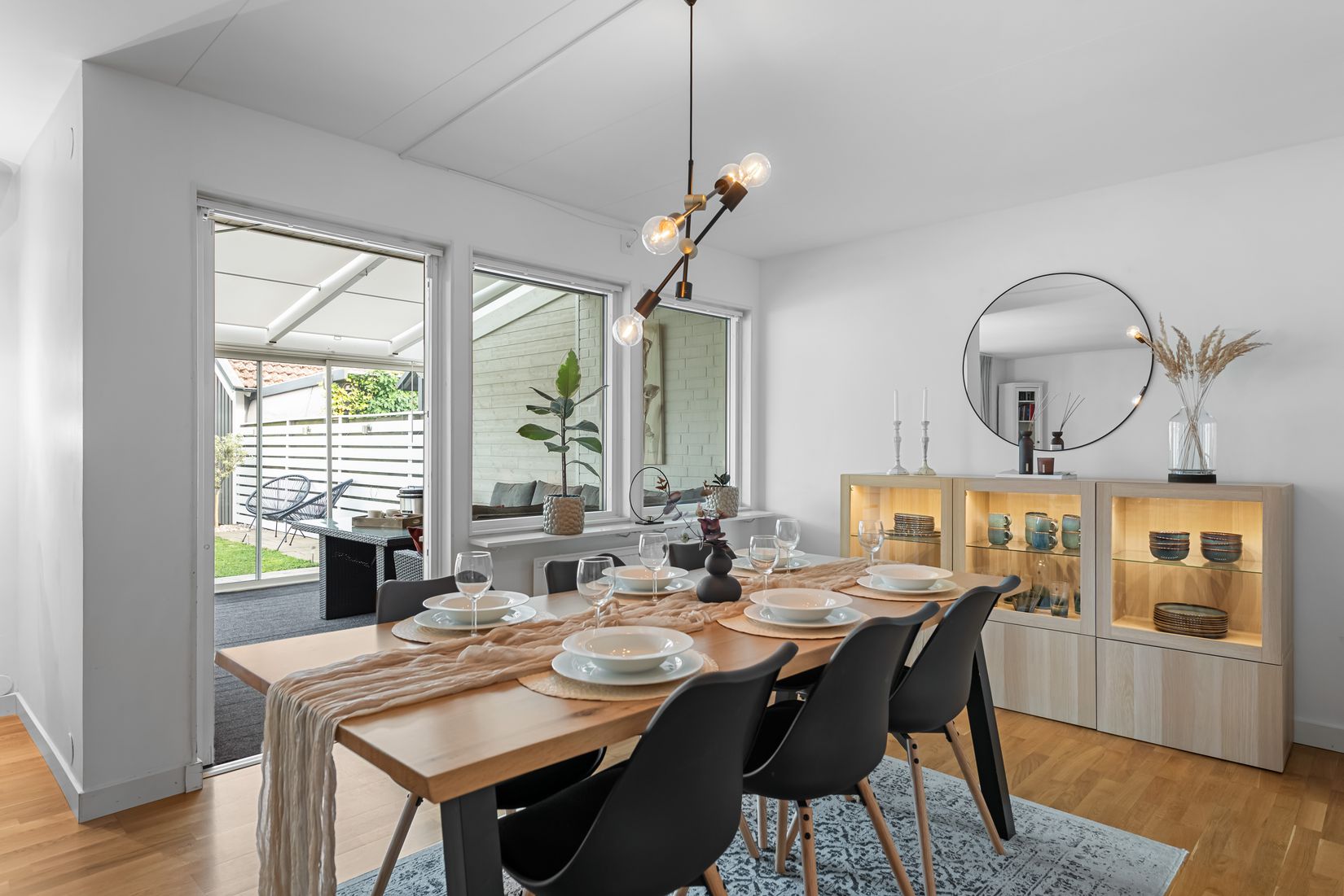 Välkommen till Sädesvägen 104, där elegans och komfort möts i ett modernt radhus om 141 kvm. Denna bostad erbjuder en perfekt balans mellan stil och funktionalitet, med generösa ytor för både sociala tillställningar och avkoppling. Vid entrén möts du av ett inbjudande vardagsrum som smidigt övergår i en matsal, idealisk för både lugna kvällar och festliga middagar. Köket, placerat direkt till höger, är utrustat med rikligt förvaringsutrymme, vilket gör matlagningen till ett rent nöje. På entréplan finns även en praktisk gästtoalett, separat dusch och utmärkt förvaring.