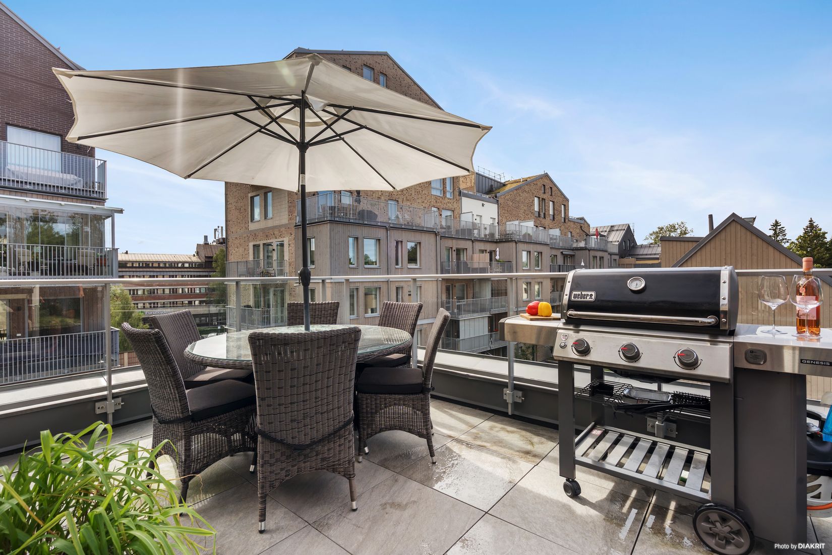 Härifrån når du även den stora, privata takterrassen med plats för loungegrupp, grill och parasoll.