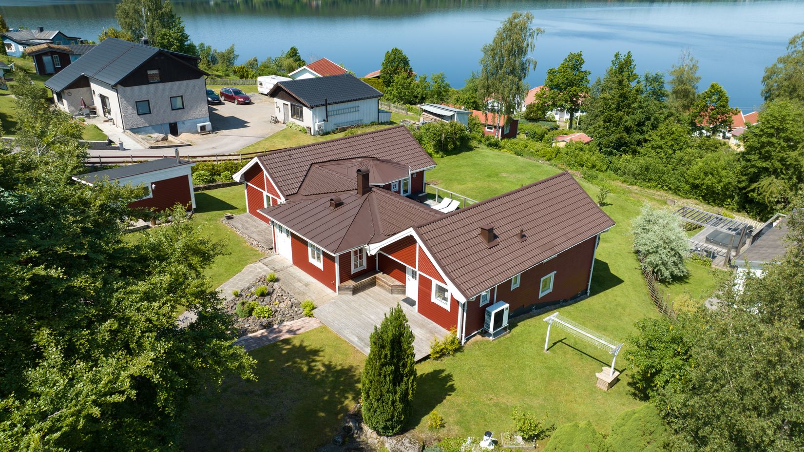 Invändigt möts du av ett hem som är både smakfullt och praktiskt utformat. Golvvärme, träfärgade golv och panelväggar skapar en varm helhet, medan de öppna sällskapsytorna låter både familjeliv och middagsbjudningar ta plats. Flera flexibla rum ger dig valfriheten att forma bostaden efter dina behov – oavsett om det handlar om sovrum, hemmakontor, lekrum eller hobbyutrymmen. Det övre allrummet, som nås via en öppen trapp, med utgång till balkong ger ett perfekt komplement till vardagsrummet, medan det nedre planet erbjuder ett mer avskilt master bedroom med egen altandörr och utsikt mot trädgård och sjö.