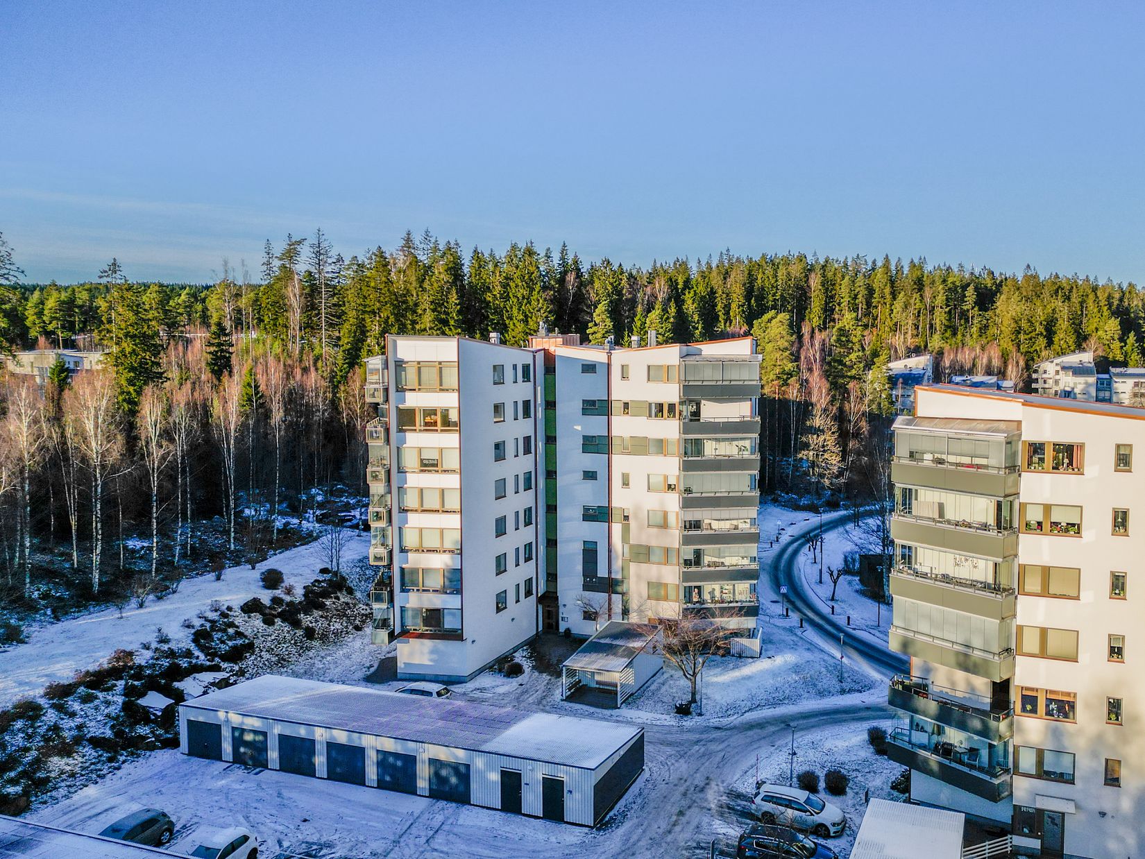 Den rymliga balkongen förlänger boendeytan och har en avkopplande utsikt över naturen runtom.
