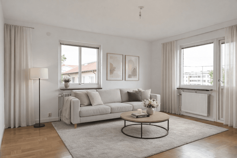 Bostaden erbjuder nya ljusa ytskikt och en luftig planlösning. Här möts du av en välkomnande hall, praktisk klädkammare, två rymliga sovrum, ljust kök, ett vardagsrum med utgång till balkong samt ett helkaklat badrum som totalrenoverades 2023 i samband med föreningens stambyte.