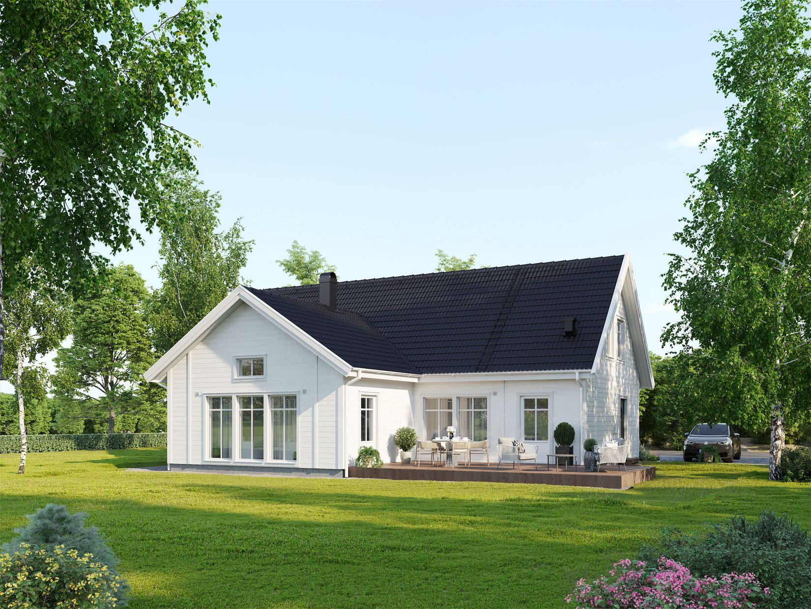 Priset inkluderar tomt, hus, totalentreprenad, markarbete samt beräknade anslutningsavgifter för el och VA.