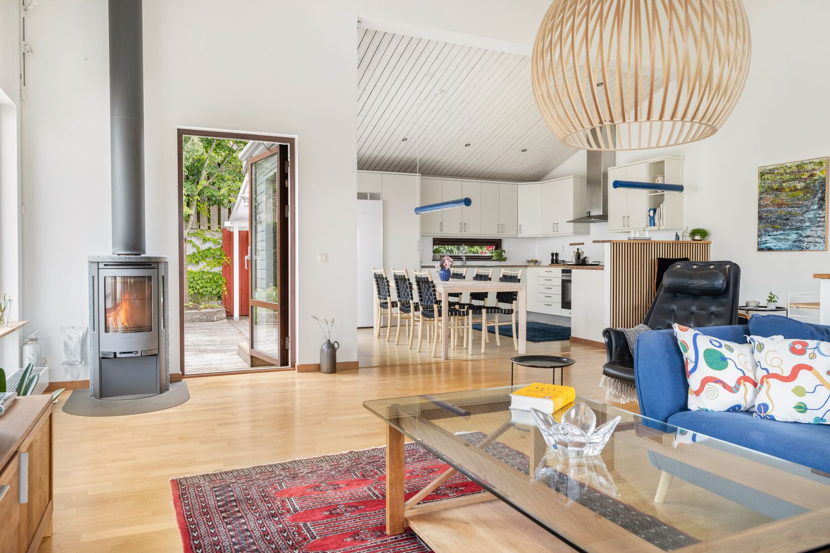 Via den öppna trappan nås det övre planet som präglas av öppen planlösning mellan kök och vardagsrum, samt en härlig rymd med öppet upp till nock som skapar en härlig atmosfär i hela rummet. Här skapas naturliga umgängesytor med plats för både matlagning, måltider och avkoppling. Från köket når du den stora altanen, en förlängning av bostaden under årets varmare månader. På detta plan finns även det tredje sovrummet, helkaklat badrum samt gott om förvaringsmöjligheter.