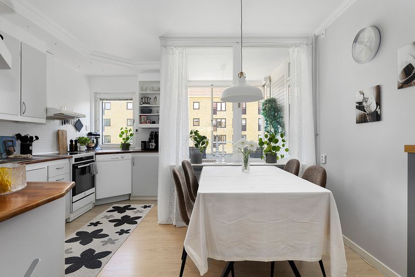 Vardagsrummet är luftigt och lättmöblerat, perfekt för både avkoppling och umgänge. Här finns även en fransk balkong som är perfekt att öppna upp för att släppa in frisk luft och vädra. Det fräscha, helkaklade badrummet är stambytt och modernt med bekvämligheter som tvättmaskin och golvvärme.