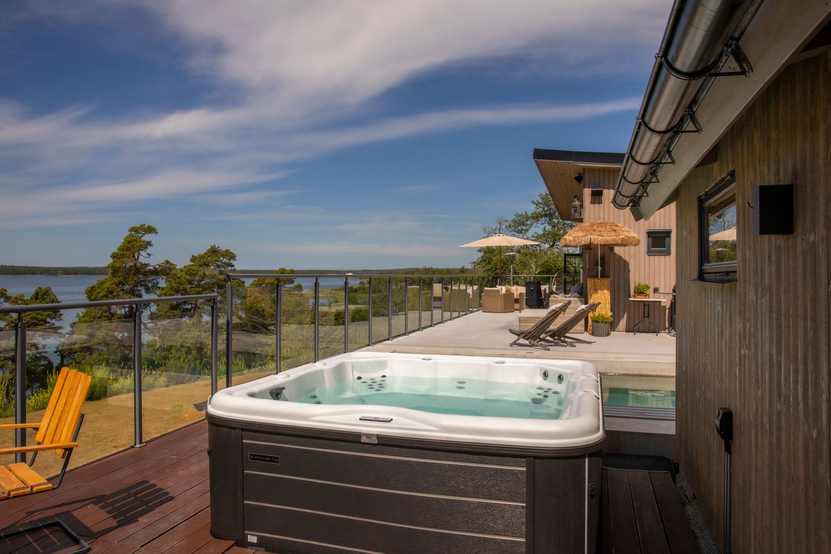 Under varma sommardagar lockar den helgjutna poolen till svalkande dopp, och när vinterkylan smyger sig på njuter du istället av spabadet på terrassen – alltid med samma stillsamma utsikt över natur och hav.