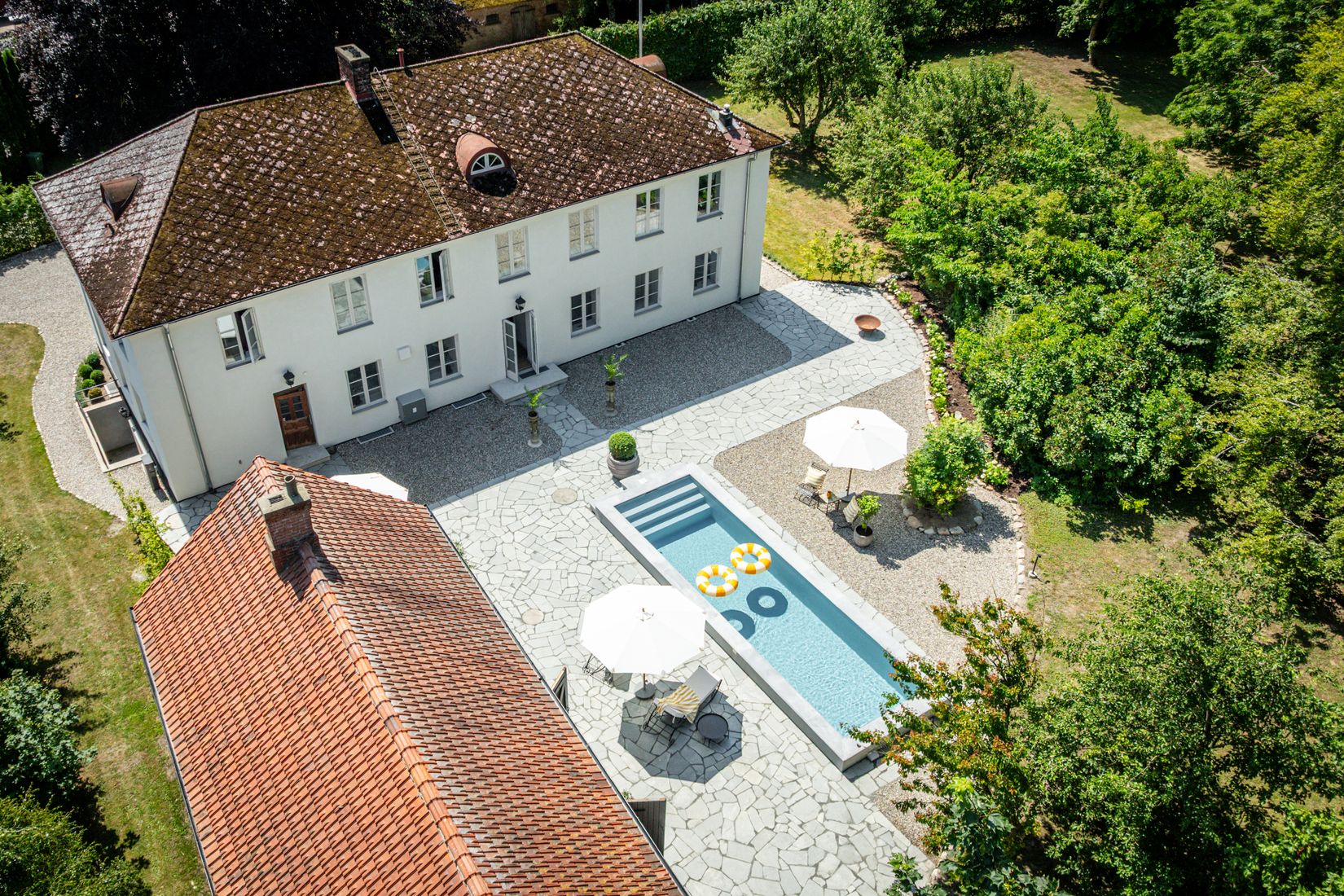 Visionen har varit tydlig – att platsen skulle återfå sin forna glans. Vid husets bortre gavel tar den stora, engelska parken vid med enorma gräsytor, murar, olika etage och höga lövträd. En mäktig bok sägs faktiskt vara Österlens äldsta. Parken gränsar till rapsfält och betesängar i utkanten av byn. Om nu husets arkitektur är fransk, och parken engelsk, har den stora stenterrassen och poolområdet klara drag av soldränkt italiensk piazza. Platsen är belagd med stenmosaik och ligger skyddad av grönska, i vinkeln mellan huset och gästhuset. En sommarkväll härute, när poolens vatten glittrar i blått och himlen är röd, känns atmosfären igen från en semesterresort vid medelhavet.