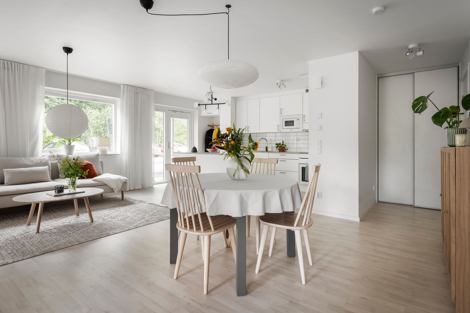 Kontakta mäklaren för visning. Välkomna till Terapislingan 12F och denna yteffektiva och välplanerad fyrarummare med öppen planlösning och uteplats med kvällssol i naturskön omgivning. Den öppna planlösningen tillsammans med ljusinsläppet från två väderstreck bidrar till känslan av rymd i bostaden. Köket är fullutrustat med det ni behöver och plats finns för ett stort matbord. Självklart får även en större soffgrupp med tillhörande möblemang plats här. Vidare finner ni master bedroom med plats för dubbelsäng och förvaring och bostadens två andra sovrum inrymmer enkelsäng med tillhörande möblemang. Från ena sovrummet når ni även bostadens härliga uteplats med utrymme för en loungegrupp. Badrummet är helkaklat och utrustat med bland annat dusch och egen tvättavdelning med både tvättmaskin, torktumlare samt avlastningsyta som förenklar vardagen. Välkomna hem!