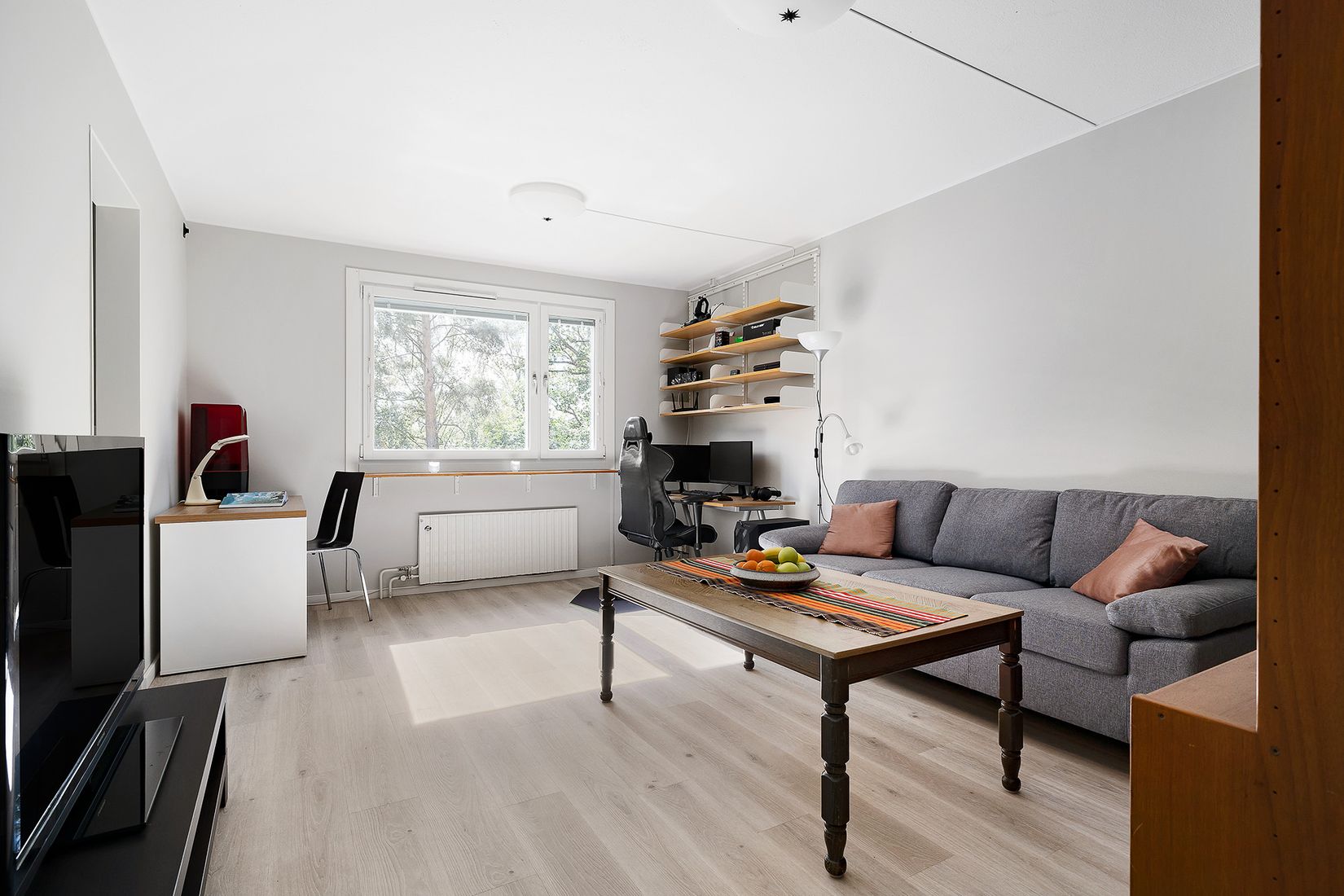 Välkommen till Kopparvägen 18 – en renoverad och yteffektiv 1,5:a om ca 41 kvm där varje kvadratmeter är väl utnyttjad. Genomgående ljusa laminatgolv löper från hallen vidare genom vardagsrum, kök och sovalkov och skapar ett enhetligt och modernt intryck.