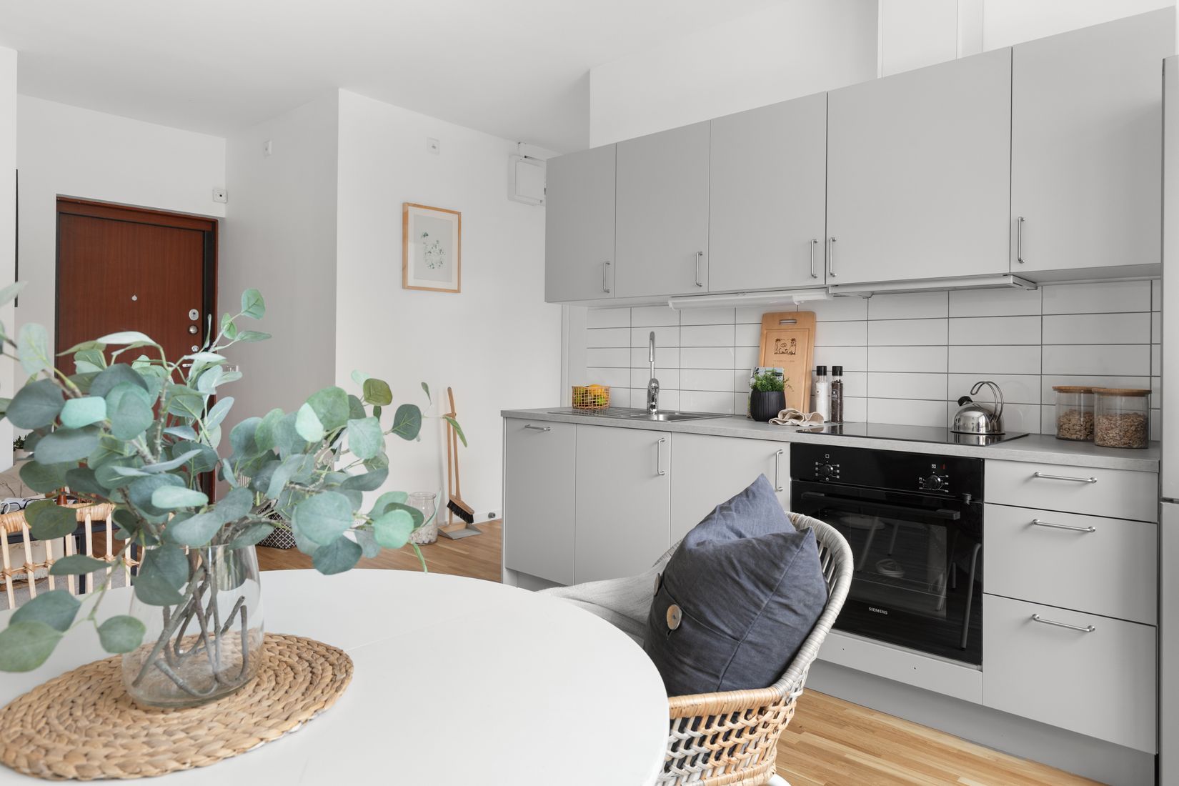 Köket är helt nytt från HTH i trendigt grått och har plats för matbord. Sovrummet är yteffektivt och mysigt, perfekt att dra sig tillbaka till efter en lång dag. Det nya, helkaklade badrummet med 10 års garanti på tätskiktet, är helkaklat, stilrent och har både dusch och egen tvättmaskin – smidigt, eller hur?