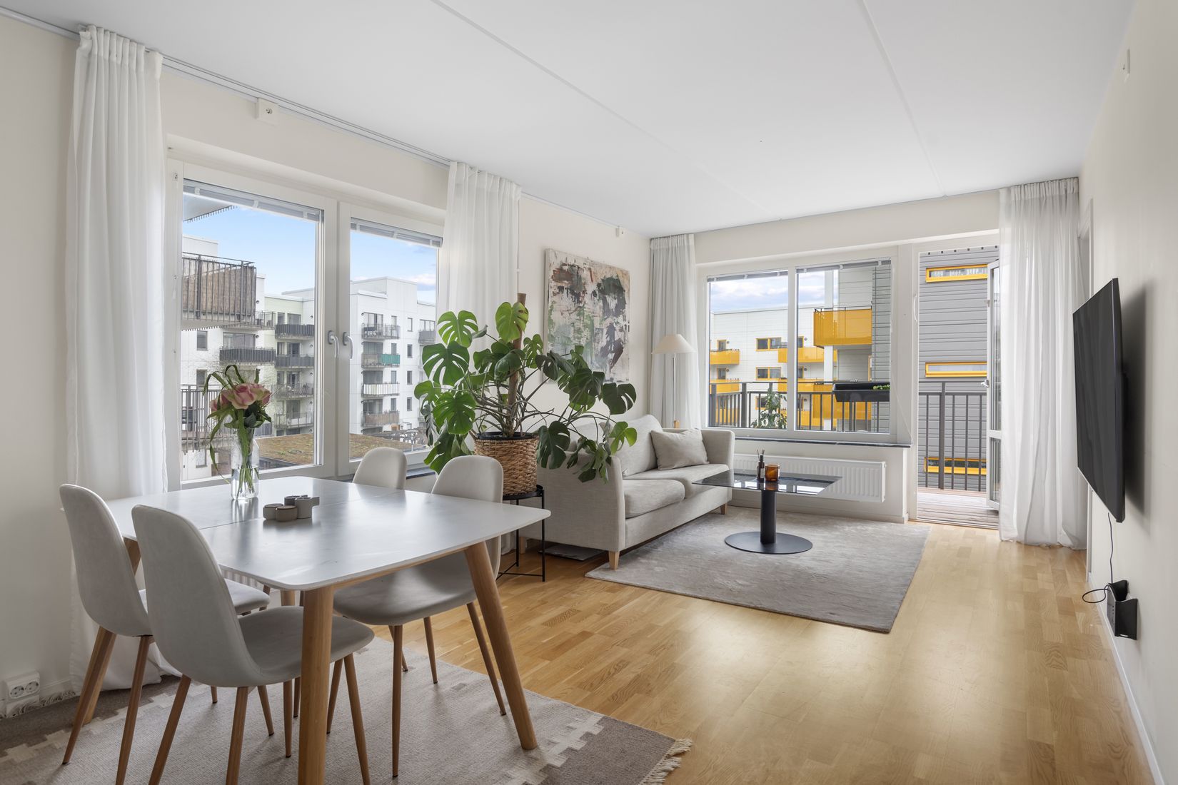 Från vardagsrummet nås den rymliga balkongen i bästa solläge med utsikt mot föreningens grönskande innergård – en plats att njuta av sol från dag till kväll.