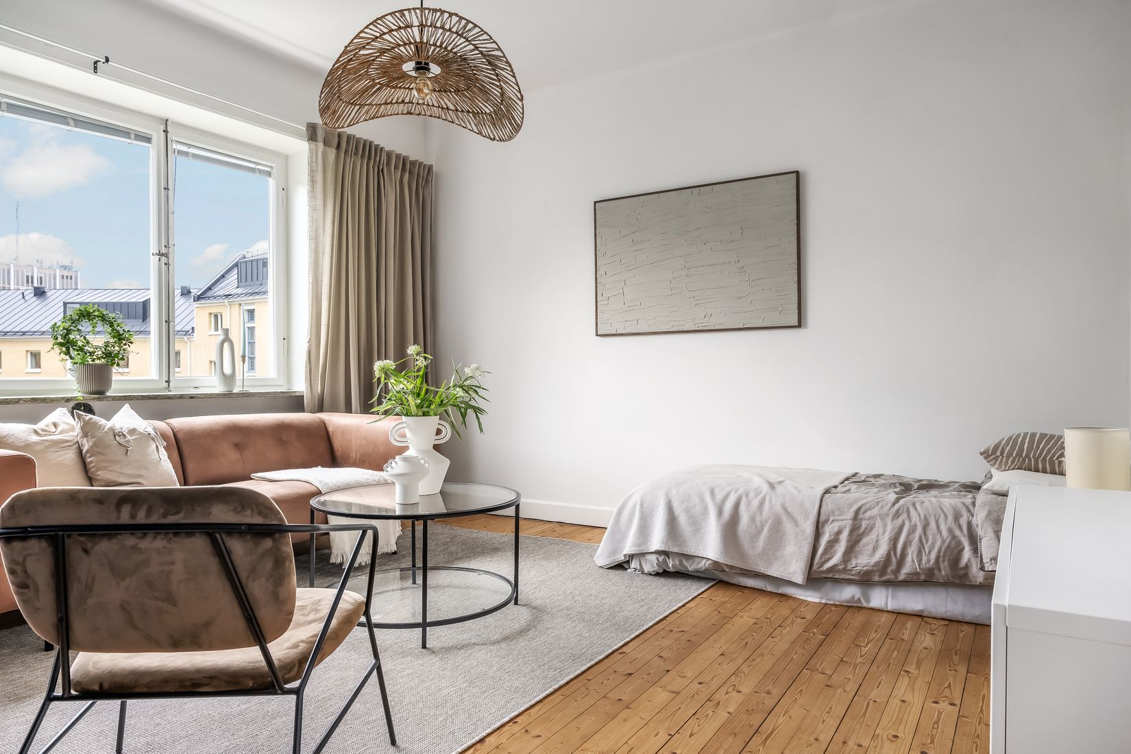 Lägenheten bjuder på ett luftigt och lättmöblerat vardagsrum där både soffa och säng får plats utan att det känns trångt.