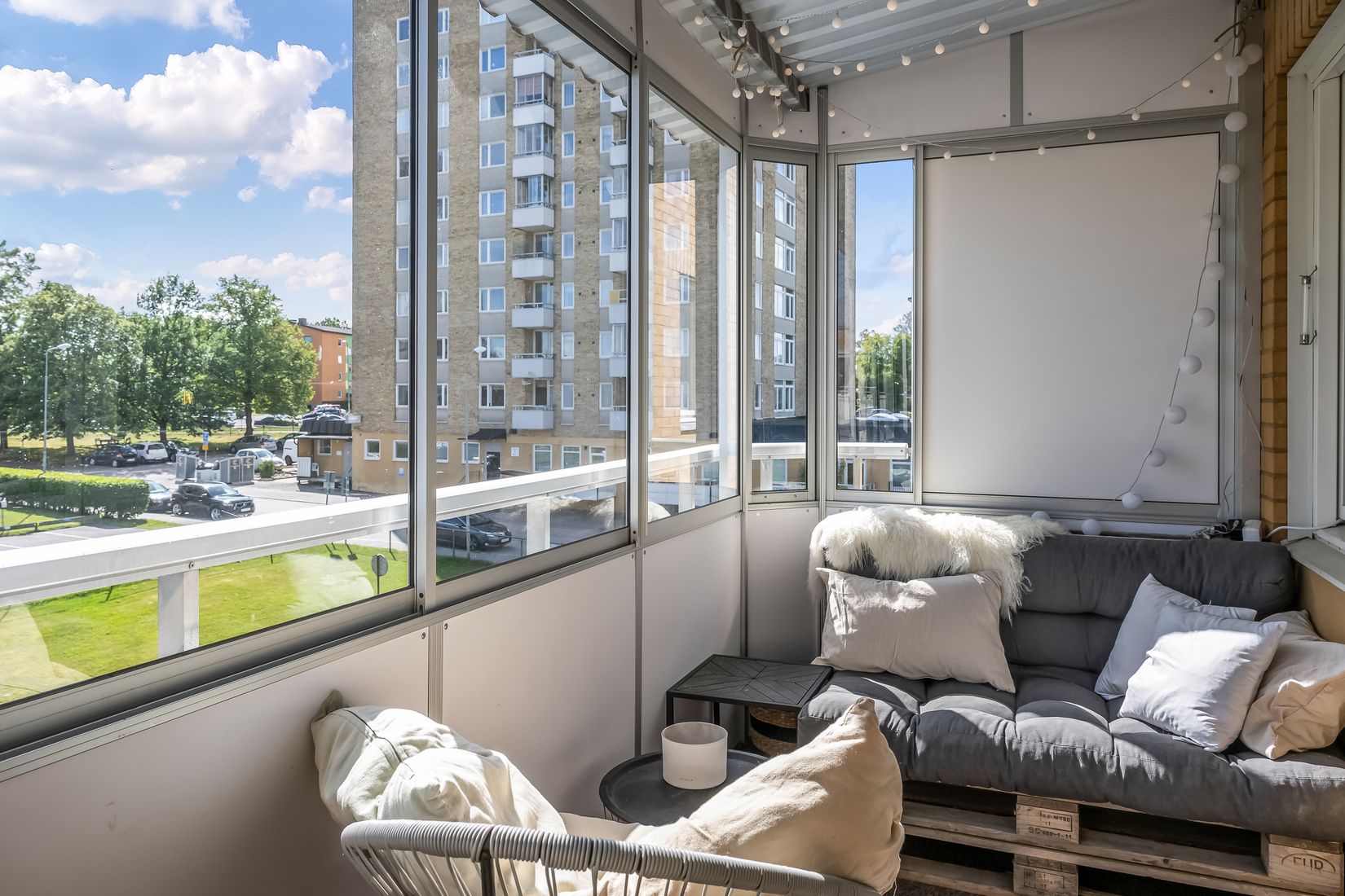 Rymlig fyrarummare med inglasad balkong och smarta förvaringslösningar - bekvämt boende med det lilla extra.