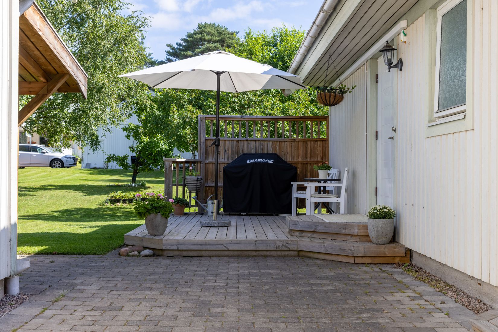 Utemiljön bjuder på flera härliga ytor att njuta av. På framsidan finns en stor, rymlig veranda med plats för både långbord och soffgrupp, som fungerar som ett extra vardagsrum under sommarhalvåret. Vid entrén ligger en altan med eftermiddagssol, idealisk för grillkvällar och på baksidan väntar en lätt skött grönskande trädgård med äppelträd, rabarber och jordgubbsodling samt robotgräsklippare som delas med grannen.