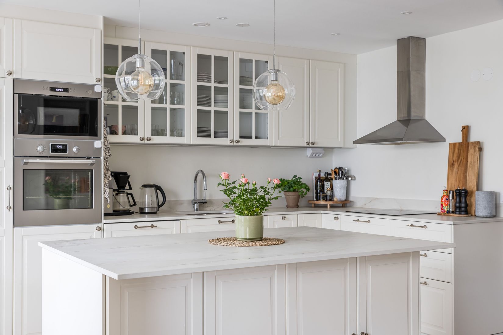 Här finns gott om arbetsyta, förvaring och plats för både matlagning och umgänge. Appstyrda spotlights ger rätt stämning vid varje tillfälle.