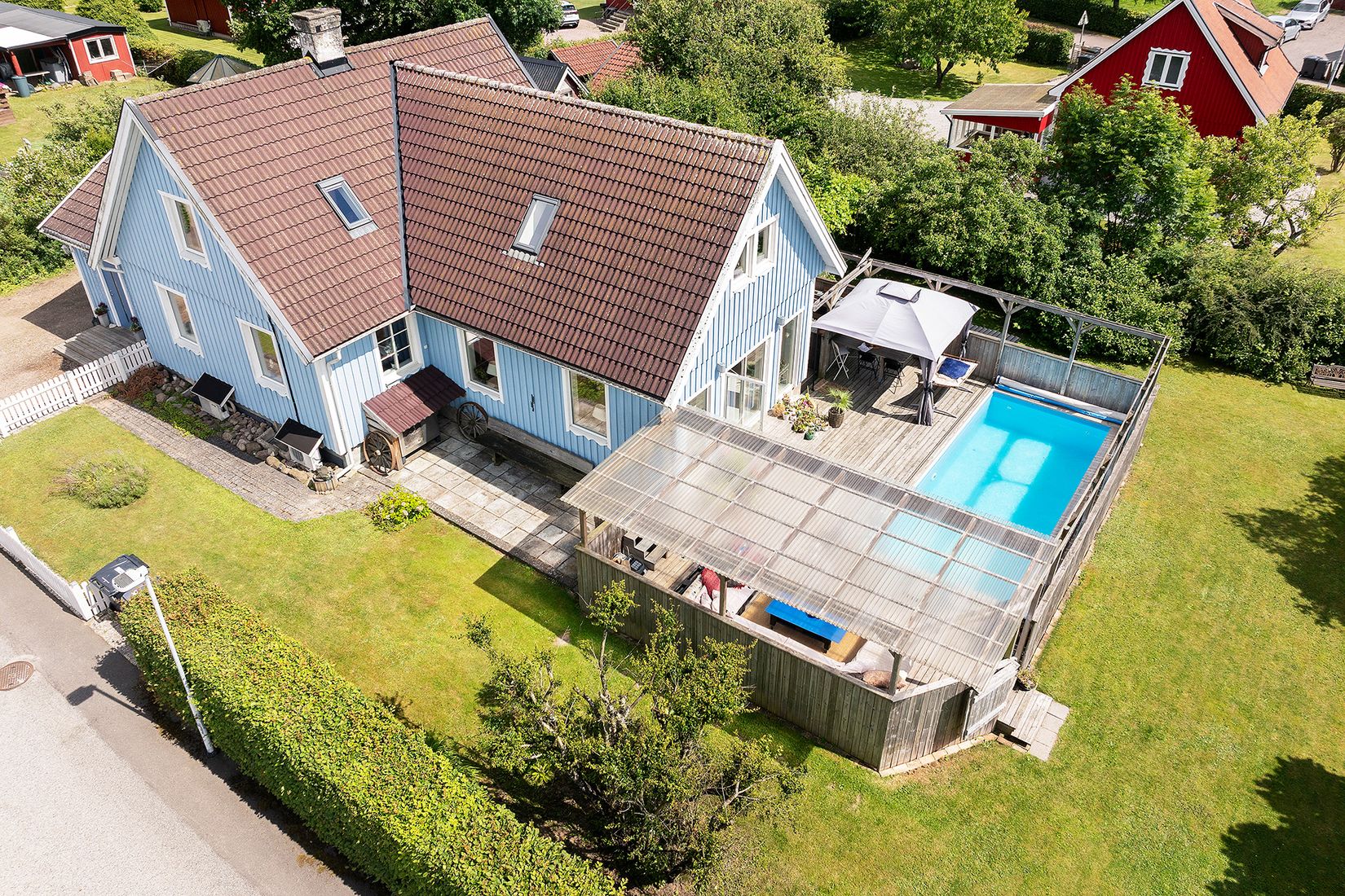 Poolen och trädgården är en njutning av högsta klass. Tänk dig att ha en egen pool hemma och bara njuta. Ett stort trädäck finns där poolen är placerad tillsammans med flera olika möjligheter att sitta, sola och äta och bara ha det riktigt bra. Runt hela pool området är det inhägnat med staket. Tidigare fanns även jacuzzi och har du den önskan så finns platsen kvar. Pool området är jättefint och jag är helt övertygad om att du kommer att njuta fullt ut. Det är som att ha semester hemma. Poolen är på ca 7 x 3,5 m och är 1,65 m djup. Utanför pool området finns din trädgård som även den har det mesta Här finns äppelträd, päronträd, hasselbuske, syrener, odlingslådor, vinranka mm. Det känns som du är i en oas utan insyn från vägen.