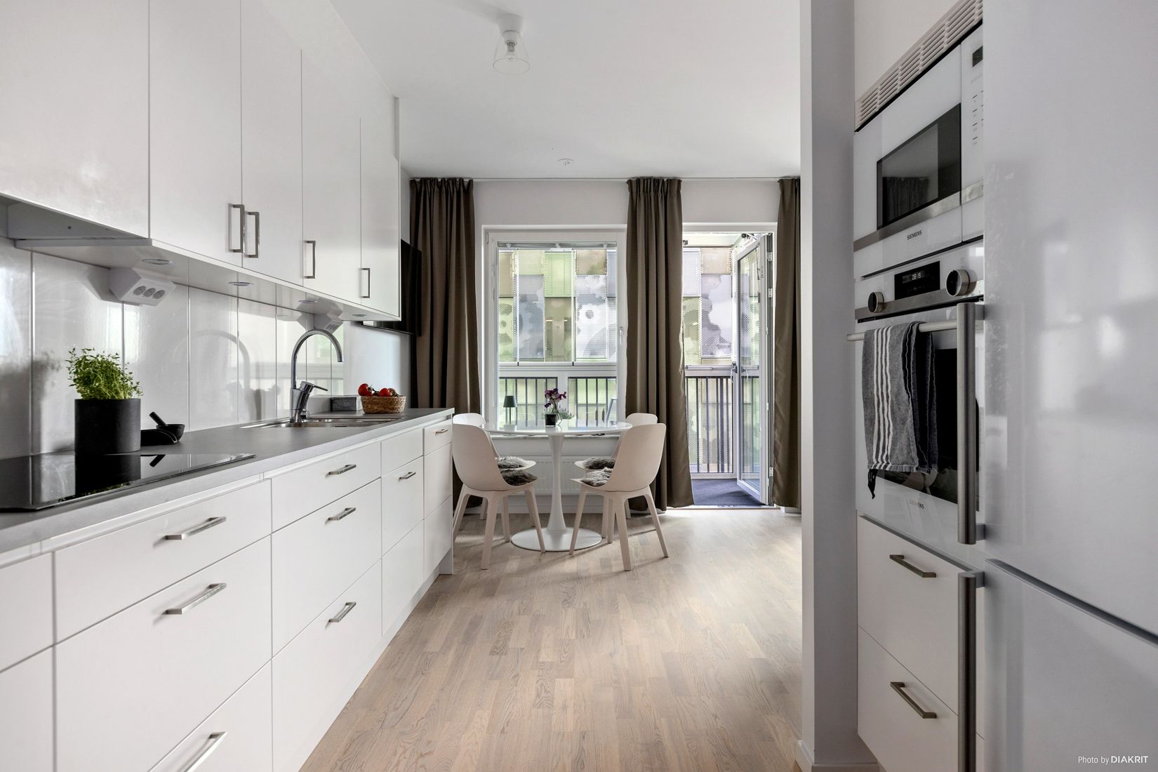 Lägenheten är inredd med snygga och moderna materialval och har en luftig och öppen planlösning med plats för matbord, soffa och säng. Sovalkoven går att dela av på ett bra sätt för att separera vardagsrum från sovplats. Från sällskapsutrymmet kommer du även ut till den inglasade balkongen. Kök från Vedum med enhetligt rostfria vitvaror av märket Siemens. Köket är även utrustat med infälld diskho, kyl/frys, integrerad diskmaskin, induktionshäll och förvaring i skåp och utdragslådor. I lägenheten finns även ett rymligt helkaklat duschrum med duschväggar och kombinerad tvättmaskin/torktumlare. Till lägenheten följer lägenhetsförråd i källaren.