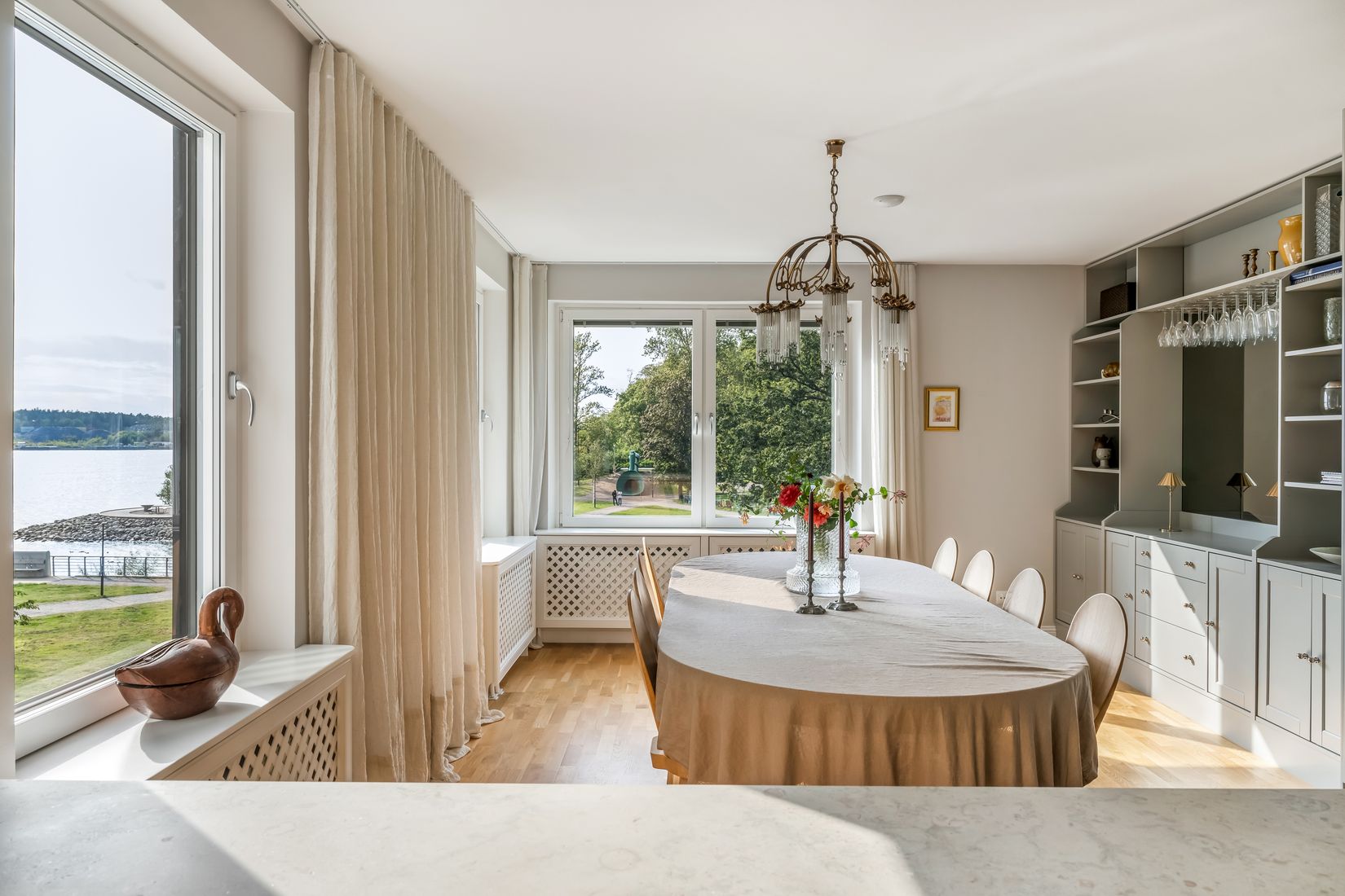 Planlösningen har öppna och luftiga sällskapsytor. Ett stort vardagsrum är beläget intill det härliga köket som ligger i öppen planlösning mot matrummet. Här utgör en stor köksö en naturlig samlingspunkt för vardagsliv och umgänge med familj, släkt, vänner och bekanta. Fyra rymliga sovrum ger plats för alla i familjen eller för att inreda efter egna behov. Med flertalet klädkammare och garderober är förvaringen här aldrig ett problem. Här finns också två moderna badrum med hög standard, det ena är utrustat med både tvättmaskin och torktumlare för extra bekvämlighet. Med två balkonger, på varsin sida av lägenheten, njuter du inte bara av utsikt mot Stockholms inlopp utan kan också ta del av solen större delen av dagen och framförallt den eftertraktade kvällssolen.