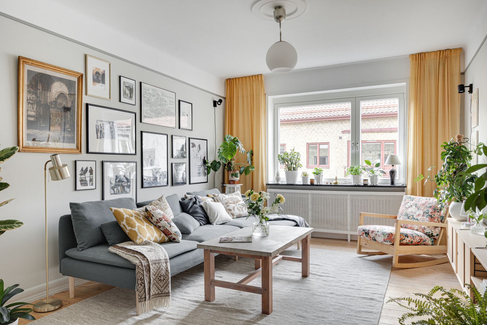 Halva / Vardagsrum - I den praktiska halvan finns gott om plats för matsalsbord för många gäster. Halvan ramas in av en blommig tapet. I vardagsrummet ges vi fint ljusinsläpp från fönster mot Sölvesborgsgatan och här finns gott om utrymme för större soffgrupp. Brädgolv och gråmålade väggar.