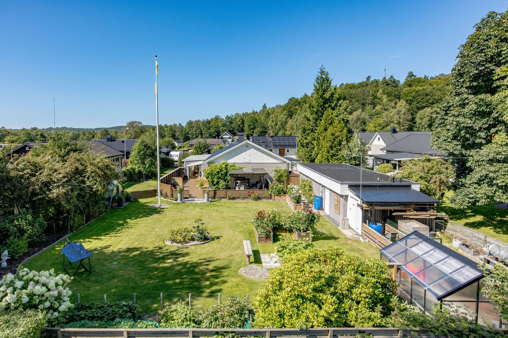 Här väntar en lummig och välplanerad trädgård med flera härliga uteplatser i sydligt läge. Perfekt för grillkvällar, lek och avkoppling. Nytt staket (2023) ramar in tomten och ger både trygghet och stil.