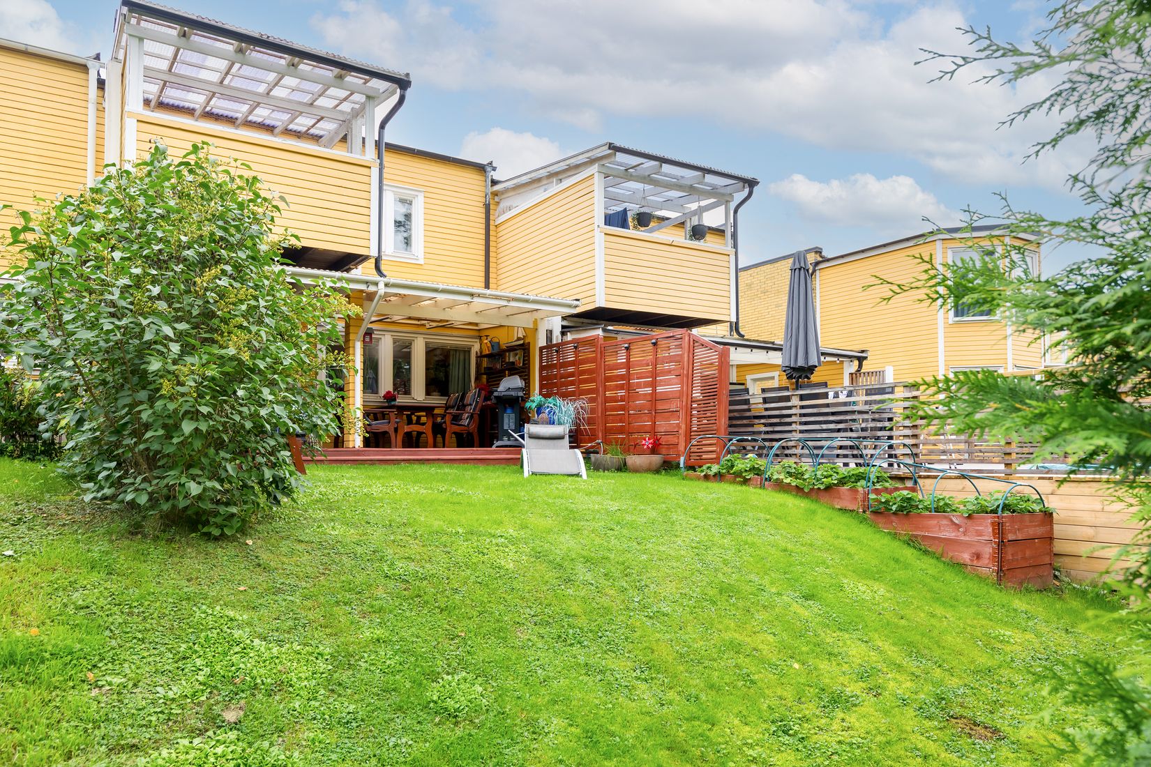 Här erbjuds ett hus med härlig insynsskyddad tomt på baksidan och med sol hela dagen perfekt för mysiga grillkvällar i vänners lag. Tomten är lättskött men bjuder ändå på odling av jordgubbar och bär samt doft av syrén, när löven fallit skymtar man även Mälaren mellan träden. Fastigheten erbjuder totalt tre terrasser där kaffet tillsammans med sjöglimten kan avnjutas.